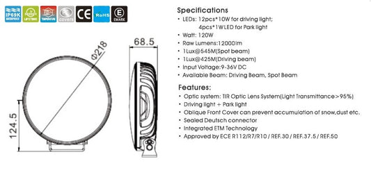 LED Диоден Халоген, Фар, с Бял Габарит, Ø 218мм, 12V 24V, 12 Диода, За Джип, Камион, Трактор, Багер, Земеделски Машини и др.