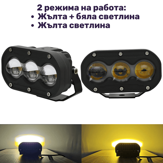 Комплект 2бр LED халогени с жълта + бяла светлина 6000K+3000K, 2 режима на работа 60W, 12V