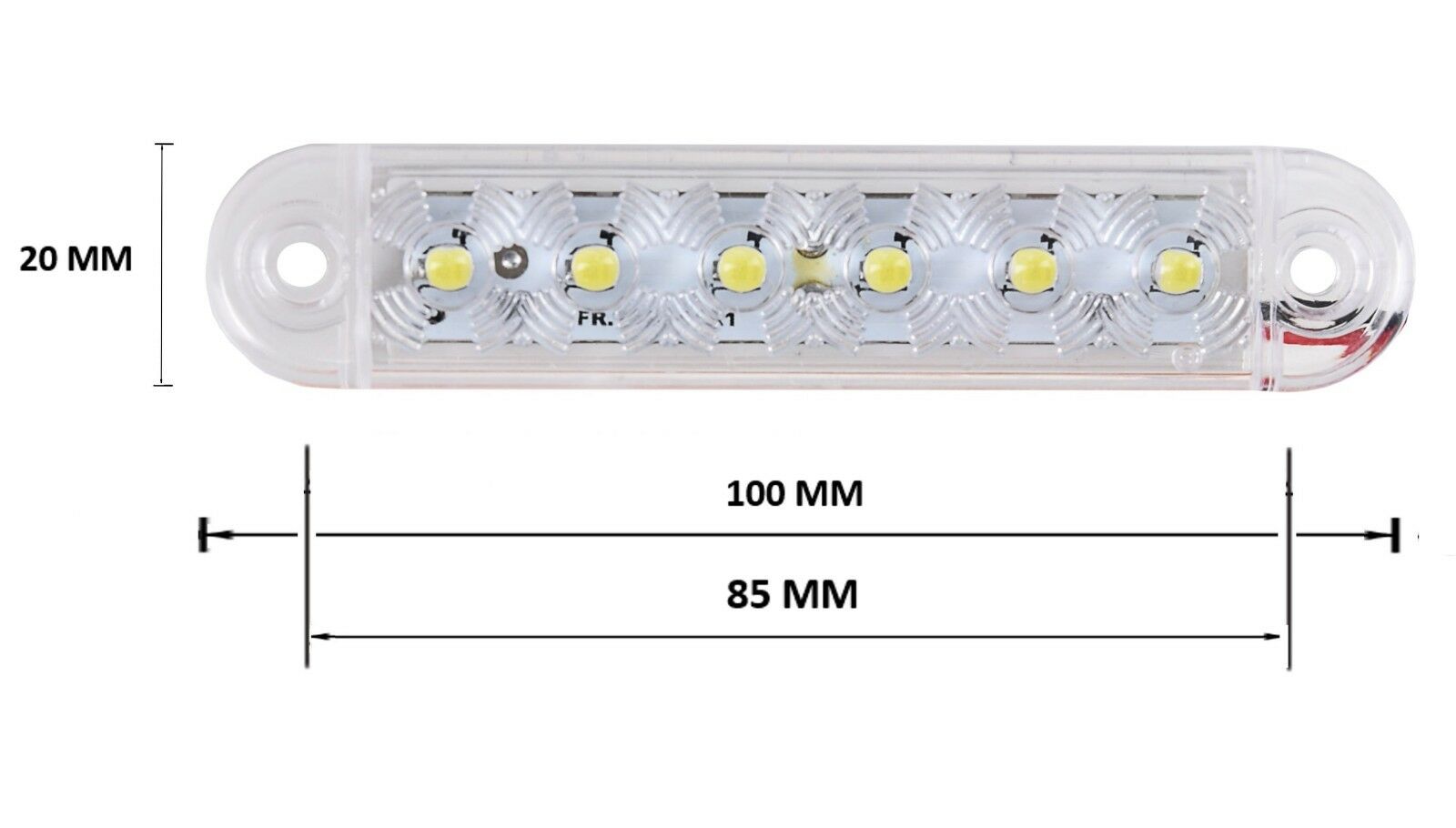 Водоустойчив Нисък разход на мощност Цвят: бял Светодиоди: 6 Приложение: отстрани/отзад Дължина: 100 мм Ширина: 20 мм Височина: 10 мм Разстояние между монтажните отвори: 85 мм НАПРЕЖЕНИЕ: 12V 24V ЦЕНАТА Е ЗА 1 БРОЙ.