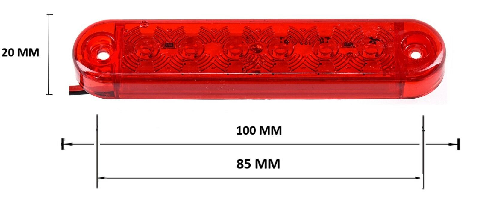 ЛЕД LED Червен Диоден Маркер Габарит Токос със 6 светодиода за камион ремарке бус ван 12V-24V ВОДОУСТОЙЧИВ НИСЪК РАЗХОД НА МОЩНОСТ ЦВЯТ: ЧЕРВЕН Светодиоди: 6 ПРИЛОЖЕНИЕ: ОТСТРАНИ/ОТЗАД ДЪЛЖИНА: 100 ММ ШИРИНА: 20 ММ ВИСОЧИНА: 10 ММ РАЗСТОЯНИЕ МЕЖДУ ДУПИ: 85 ММ НАПРЕЖЕНИЕ: 12V 24V ЦЕНАТА Е ЗА 1 БРОЙ.