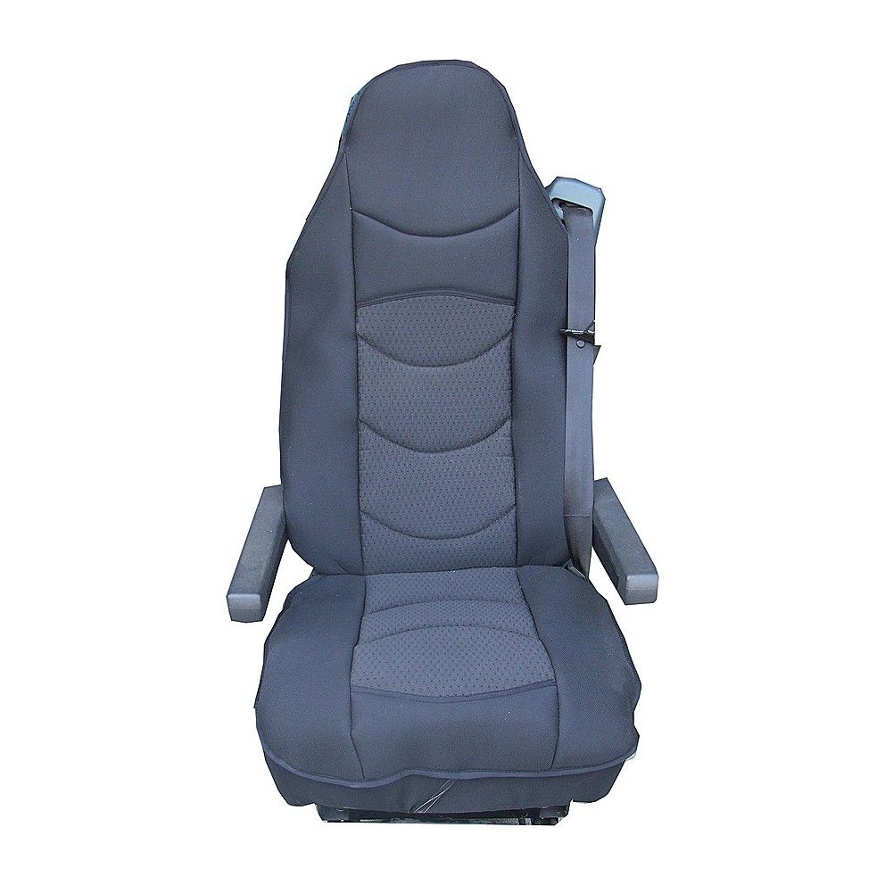 Tекстилна тапицерия за автомобилни седалки - универсална, подложка на повечето модели товарни автомобили Удобна за използване. Протекторът за седалки за тежкотоварни автомобили защитава седалките, като запазва оригиналната тапицерия от замърсяване и износване, а ви осигурява удобство. Създава комфортна атмосфера във вашия автомобил Изработени са от високо качествени материали Съдържа: - 1 калъф за седалка - цвят: Черен