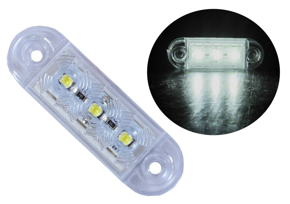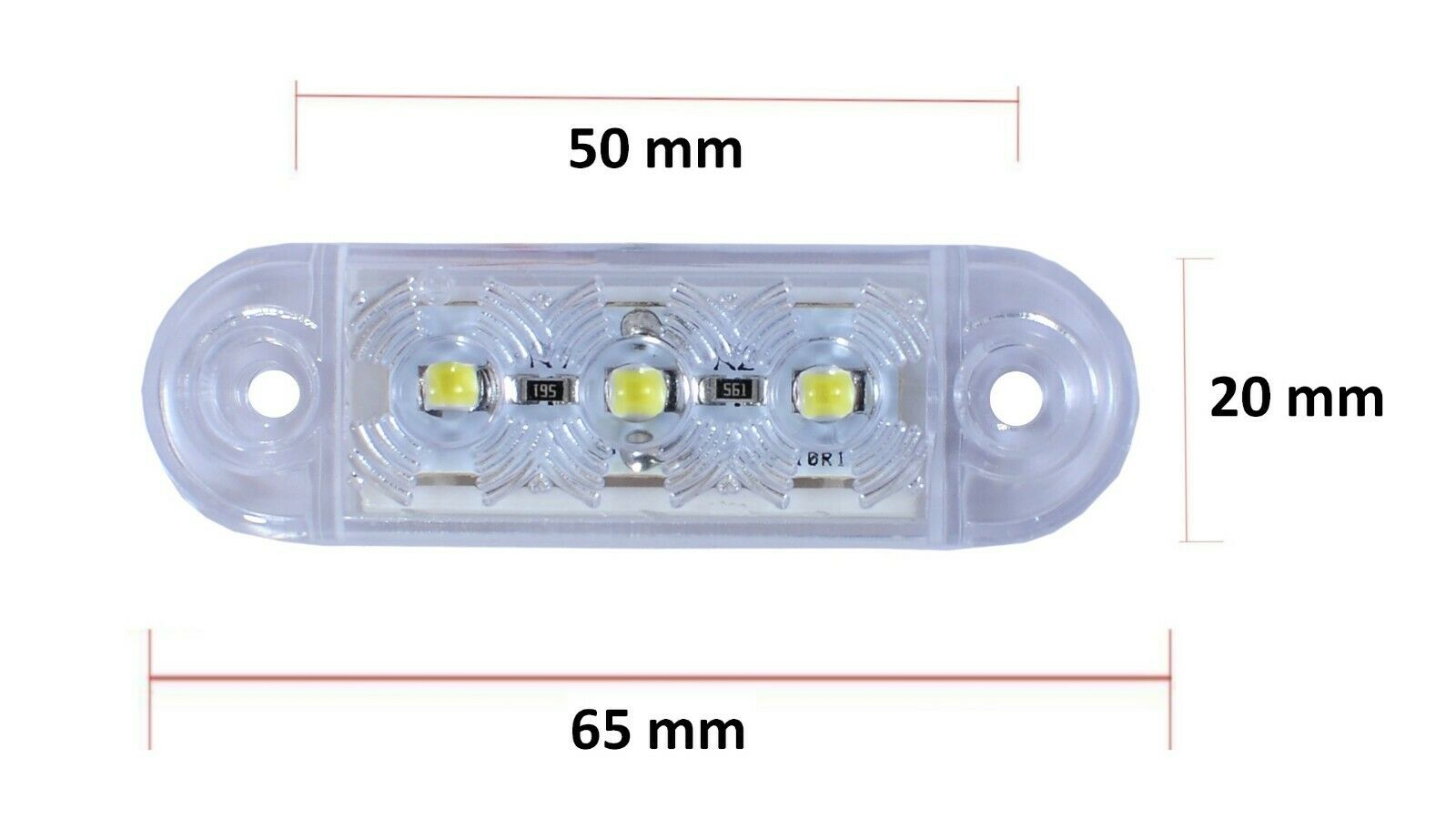 3 LED преден маркер токос габарит - / БЯЛ / - - за бус, платформа, камион, ремарке, автобус ** водоустойчив Размери: Дължина: 65mm Ширина: 10mm Височина: 20mm Разстояние между болтовете: 50mm Работно напрежение: мултиволтаж 12V - 24V