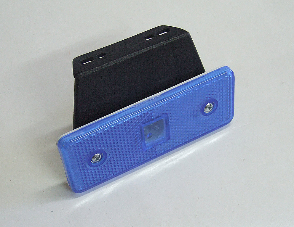 Син LED габарит/маркер 12V за ТИР, ремарке, ван и др. Характеристики: 4 LED SMD светлини във всеки маркер (нова технология за повече светлина) Размери: 110 мм х 40 мм, височина: 75 мм включително гумената подложка (за висящ монтаж) Разстояние между центрове за монтаж: 75 мм Подходящ за всички видове МПС с 12V електрическа система