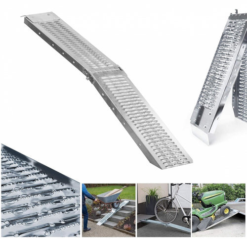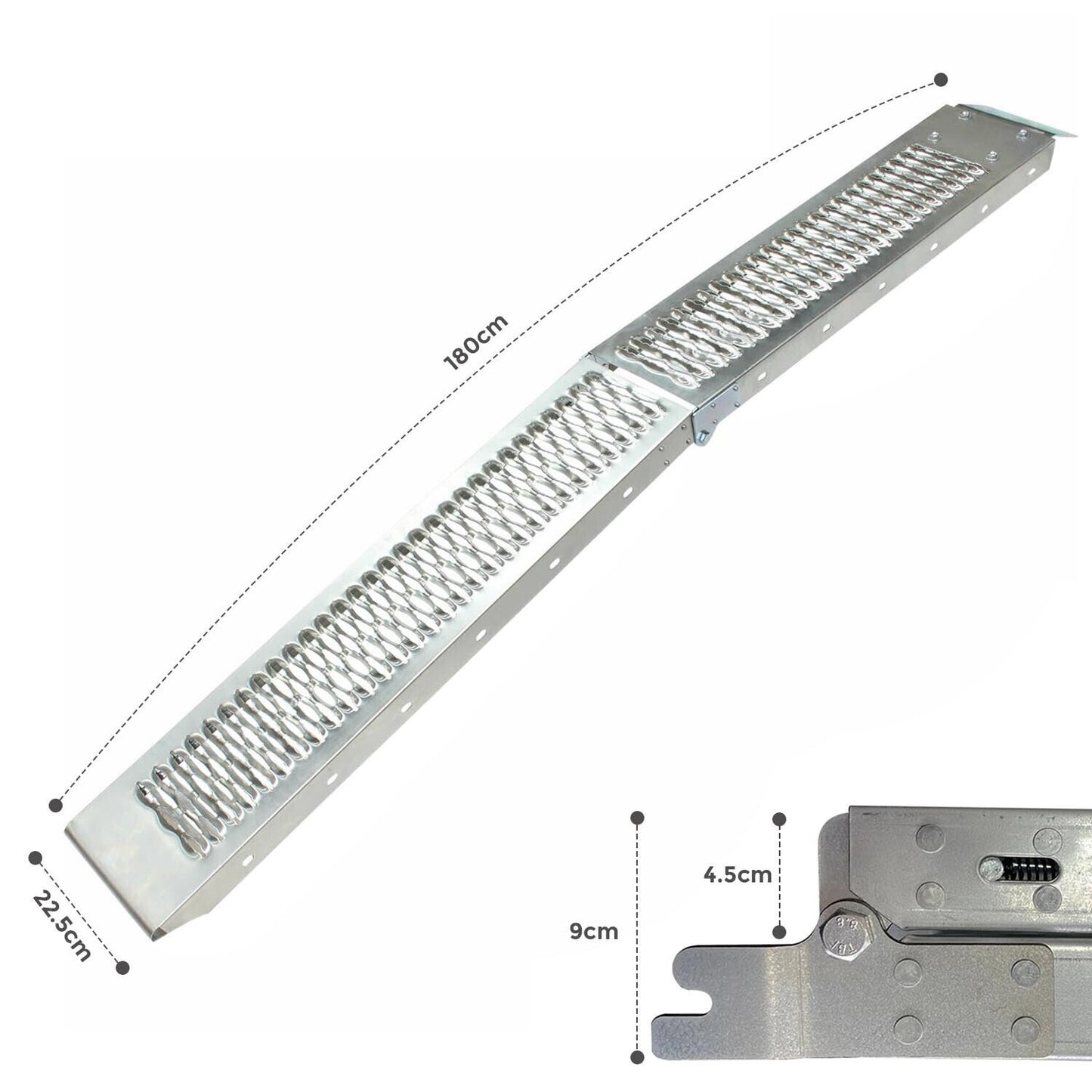Тази рампа е идеална за лесно товарене и разтоварване на АТВ, бъгита, мобилни скутери, голф колички и др. Покритието и предотвратява плъзгане и са изградени от висококачествена поцинкована стомана, което ги прави изключително стабилни и издръжливи. Товароносимост: 200 кг. на рампа Размери в разгънато положение: 1800 х 225 х 45 мм Размери в сгънато положение: 915 х 225 х 90 мм