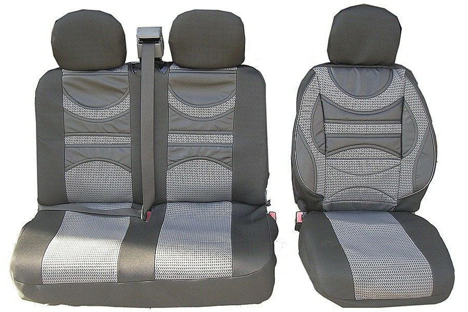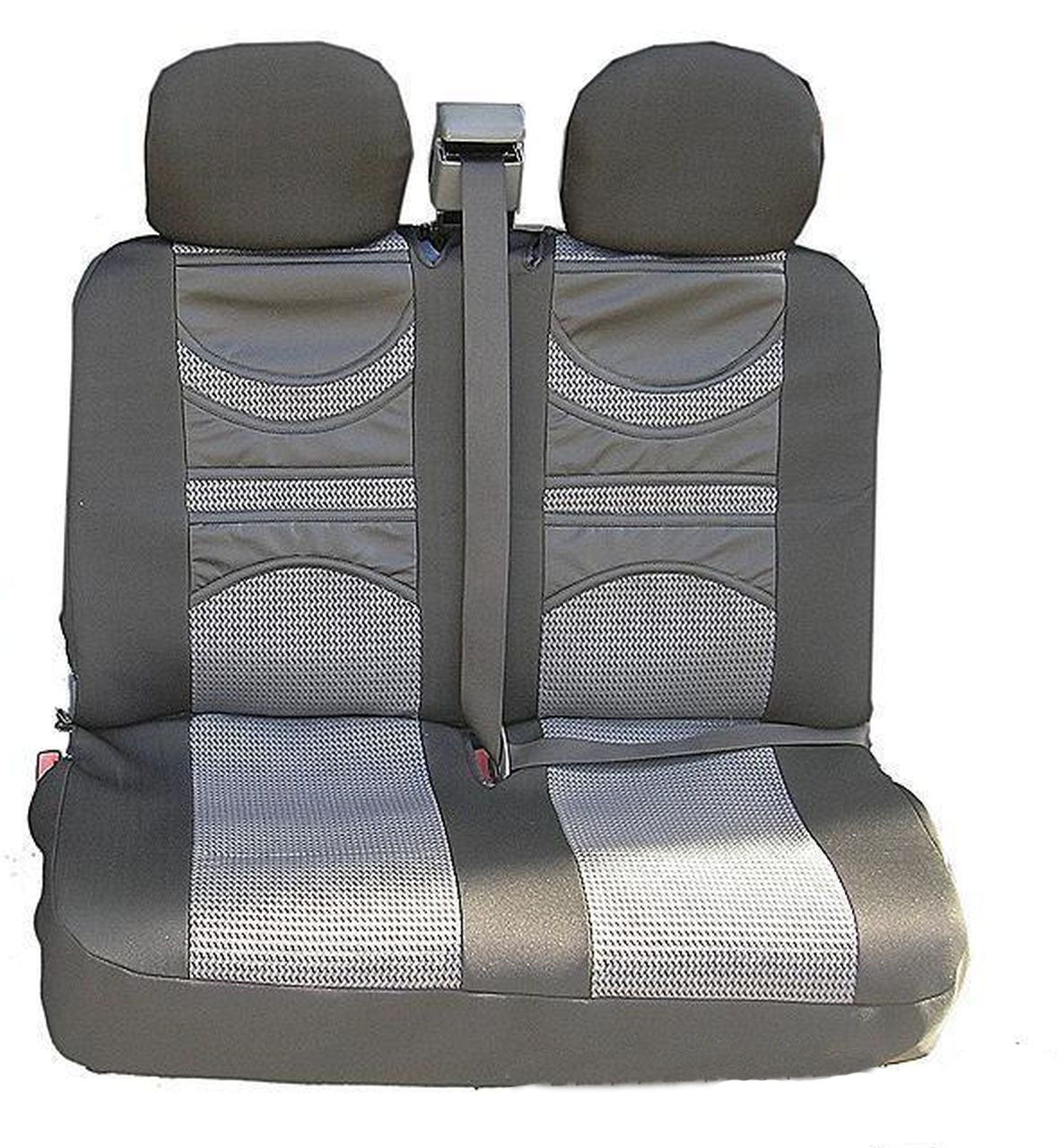 Комплект универсални калъфи / тапицерия Premium 1 за бус с опора в лумбалната област / светло сиво и тъмно сиво / Пълен комплект: Шофьорска седалка и двойна пасажерска седалка. 1 x калъф за шофьорската седалка 1 x калъф за двойна пасажерска седалка 3 x калъфи за облегалки за глава * подходящи за бусове с ляв и десен волан * Бързо и лесно монтиране - просто поставете върху оригиналните седалки (с ластици отдолу, така, че да се изпъват сегнато по седалките) * Подходящи са за бусове с въздушни възглавници и могат да се ползват с един или два подлакътника. * Лесно почистване - просто забършете - Тези калъфи са предназначени да предпазят вашата оригинална тапицерия от замърсяване и износване. - Дори редовно почистване не може да спре ежедневното износване. - Защитете оригиналната тапицерия на автомобила си. За въпроси може да ни потърсите на посочения телефон в работно време.