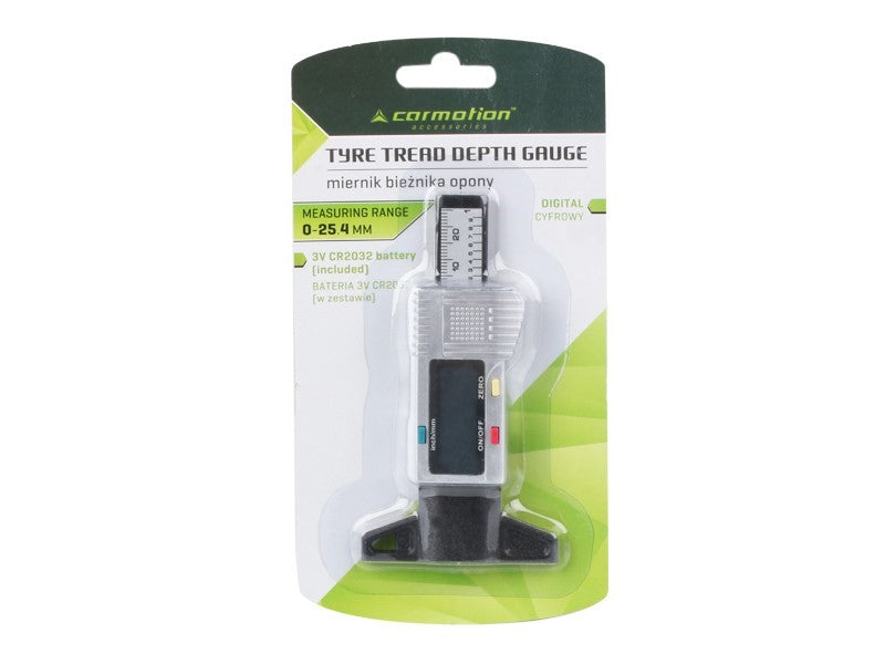 Дигитален измервателен уред, предназначен да оцени степента на износване на гумата. Опростеният дизайн и високото качество на изработка гарантират надеждни измервания и продължителна употреба. Измерване в инчове или мм. Големият и лесен за четене дисплей прави този уред подходящ за всеки автосервиз. Устройството е удобно и разполага с бързо превключване между метрични и инчови измервания. Технически данни: Диапазон на измерване: 00-25.4мм Точност: 0.01мм Мерни единици: инч/мм Захранване: 1 батерия SR44/LR44 1.5V Размери: 60мм x 113мм x 13мм