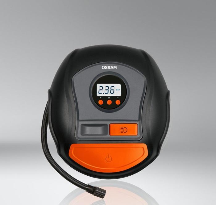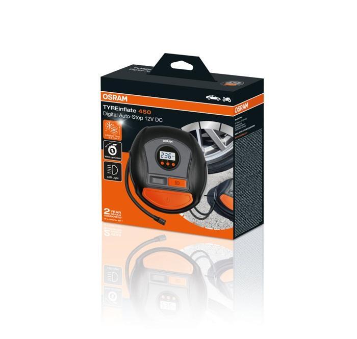 Дигитален компресор Osram модел 450 с удобен и голям бутон за стартиране. Компресора разполага с отдление за съхранение на капачки за винтили. Мултиметъра, който е разположен над бутона за стартиране може да наблюдаване стойности за налягане по kPA, bar и PSI. Захранването е 12V, като се използва конектор за запалка. В комплекта ще откриете три адаптора за напомпване на гуми: Велосипед, мотоциклет, топки и други.