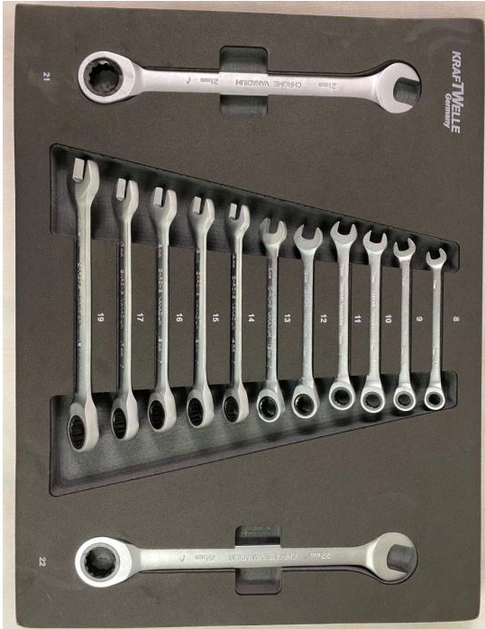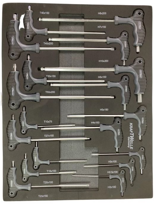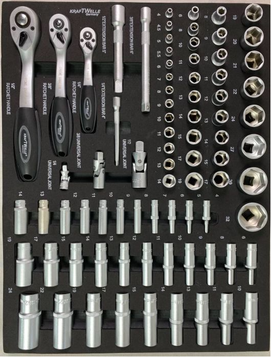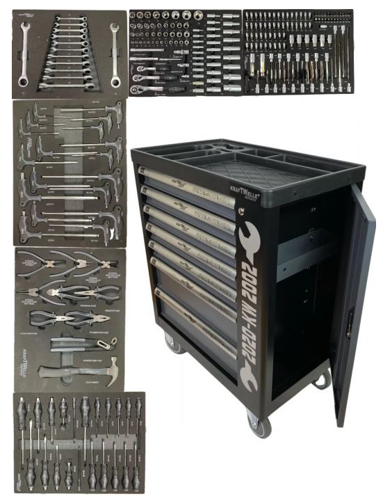 Кутия за инструменти количка с 7 отделения - 6 пълни чекмеджета и 1 празно. Шкаф тип количка за инструменти с общо 7 отделения - 6 чекмеджета пълни и 1 празно. Изработен от здрава стоманена ламарина за повече устойчивост, здравина и издръжливост. Шкафът е снабден с ергономични дръжки за удобен захват и централно заключване с цилиндрична ключалка. Заключване за безопасност с една ръка по всяко чекмедже предотвратява отваряне по време на движение. Стабилни чекмеджета и сачмен лагер на чекмеджета за безопасно и гладко движение при голямо натоварване. Количката има ъглови буфери, които предпазват от случайни повреди, например каросерия на автомобила. Горната част е универсално перфорирана (изработена от полипропилен). Количката съдържа професионални инструменти , тресчотки , вложки , клещи , всякакви отвертки , ключове с тресчотка, зегер клещи , избиващи и други. Характеристики: 4 колела с диаметър 150мм.; 2 фиксирани колела; 2 колелца (1 със спирачка); Общо натоварване 500 кг.; 6 напълно оборудвани чекмеджета; 1 голямо празно чекмедже; Размери: Височина 102 см х Щитина 79 см х Дълбочина 48,5 см Чекмедже 1 1/2 шестостенни вложки (Д=36mm): 8, 9, 10, 11, 12, 13, 14, 15, 17, 19, 20, 21, 22, 24, 27, 30, 32 mm; 3/8 шестостенни вложки (Д=26mm): 6, 8, 10, 11, 12, 13, 14, 15, 17, 19 mm; 1/4 шестограмни вложки (Д=20mm): 4, 4.5, 5, 5.5, 6, 7, 8, 9, 10, 11, 12, 13, 14 mm; 1/4 дълбоки шестостенни вложки (Д=48mm): 5, 6, 7, 8, 9, 10, 11, 12, 13, 14 mm; 3/8 дълбоки шестостенни вложки (Д=65mm): 6, 8, 9, 10, 11, 12, 13, 14, 15, 17, 19 mm; 1/2 дълбоки шестограмни вложки (Д=77mm): 10, 11, 13, 14, 15, 17, 19, 22, 24 mm; 1/4 удължение 4 (100mm); 1/2 удължение 5 (125mm); 3/8 удължение 6 (150mm); 1/4 Universal Joint; 3/8 Universal Joint 1/2 Universal Joint; Тресчотка 1/4 , 72 зъба; Тресчотка 3/8 , 72 зъба; Тресчотка 1/2 , 72 зъба; Чекмедже 2 Комплект 13 броя звездогаечни тресчотъчни ключове: 8, 9, 10, 11, 12, 13, 14, 15, 16, 17, 19, 20, 21, 22 mm; Чекмедже 3 Ударни отвертки; Прави: 6x38, 5x75, 6x100, 8x150mm.; Филипс: PH2x38, PH1x75mm, PH2x100mm, PH3x150mm.; Торкс: T6x75, T7x75, T8x75, T9x75, T10x75, T15x100, T20x100, T25x100, T27x100, T30x100, T40x150mm.; Малки отвертки; SL 3x100mm.; Philips PH0x100mm.; Чекмедже 4: T-образни торксове; T10x75, T15x100, T20x100, T25x150, T27x150, T30x150, T40x150, T45x200, T50x200mm.; Т-образни шестограми; H2x100, H2.5x100, H3x100, H4x150, H5x150, H6x150, H7x150, H8x200, H10x200mm.; Чекмедже 5: Чук; Клещи тип Гарги 10 ; Клещи 6 ; Клещи с удължени челюсти 6 ; Клещи с извити челюсти 6 ; Клещи резачки 6 ; 90 извити, отварящи клещи за зегери 6 ; 90 извити, затварящи клещи за зегери 6 ; Клещи за зегери, отварящи 6 ; Клещи за зегери, затварящи 6 ; Избивач, осмограм 3x150mm.; Избивач, осмограм 4x150mm.; Избивач, осмограм 5x150mm.; Избивач, осмограм 6x150mm.; Избивач, осмограм 8x150mm.; Избивач, осмограм 10x150mm.; Чекмедже 6: Битови накрайници: Н2, Н4, H5, H6; PZ0, PZ1, PZ2, PZ3; PH0, PH1, PH2, PH3; SL4, SL5, SL6, SL7; H4, H6, H8, H10; S0, S1, S2, S3; HW3, HW4, HW5, HW6, HW7, HW8; T8, T9, T10, T15, T20, T25, T27, T30, T40; TT8, TT9, TT10, TT15, TT20, TT25, TT27, TT30, TT40; SL6.5, SL6, SL5.5, SL4, PH4, PH3, PH2, PH1, PZ4, PZ3, PZ2, PZ1; H10, H8, H7, TT50, TT45, TT40, T45, T40, T35, T30, T27, T20; 3/8 COUPLE; M16, H24, H22, H19, H17, H14; T80, M16, T40, T50, M10, M12, T70, H10, H11, MP8, MP7, M18, M9, MP9, T45, T55, MP10, T60, M14, H13, H5, H7. Чекмедже 7: Празно.