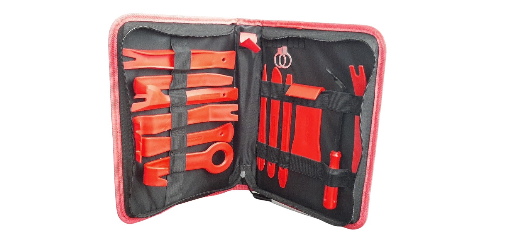 Комплект от 14 инструмента за демонтаж без повреди на декоративни части, пластмасови щипки, капаци, стъкла за огледало за обратно виждане и др. Идеален за използване на труднодостъпни места и върху боядисани повърхности. Широка гама от приложения благодарение на голям брой различни инструменти за демонтиране. Може да се ползват за: премахване на тапицерия лайсни панели табло коруби щипки Подсилени са с фибростъкло за максимална здравина. Издържащ и еластичен материал: Здравите и еластични инструменти имат силата да извадят панелите и да изкарат отворените задържащи щифтове на панела, но са достатъчно меки, за да не повредят деликатното покритие на вашия автомобил. 11 инструмента за разглобяване на пластмаса, подсилени със стъклени влакна, с шлицови, прави и ъглови конструкции, за демонтиране на декоративни ленти, огледални стъкла, капаци и панели в интериора и екстериора на купето. Инструмент за сваляне на тапицерията на вратата, дължина 220 mm, 45 градуса под ъгъл с 6 mm отвор, за демонтиране напр. панели за врати и части от интериора. 2 куки за изтегляне на радио, за автомобилни радиоплеъри с два отключващи слота 9x1 mm, подходящи за напр. Becker, Blaupunkt, Alpine, Mercedes-Benz, Skoda, Audi, Ford и много други. Опаковани в удобен калъф за съхранение.