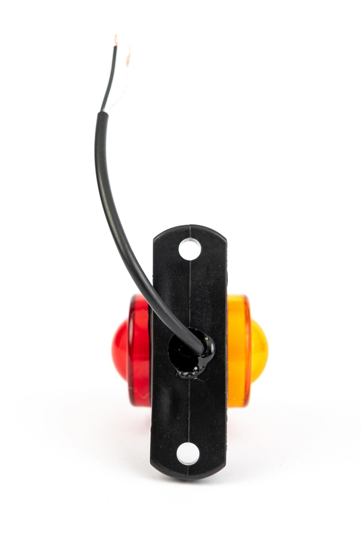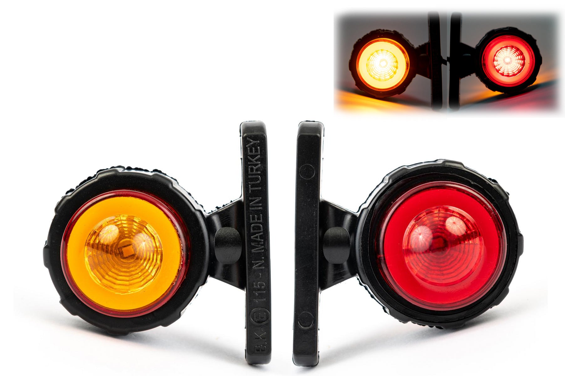 Комплект от два броя - гумени странични рогчета/маркери оранжев, жълт цвят -[]- червен цвят - габаритни светлини за камиони, тирове и ремаркета Размери: Дължина: 67mm Ширина: 61mm Разстояние между болтовете: 60mm Работно напрежение: 12V 24V