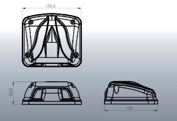 * 12V 24V (Multi Voltage) * LED Диоди: 12 бр. (4 бели и 8 червени) * Материал: ABS пластмаса Размери: 135 mm x 123 mm Височина - 60 mm Център за закрепване към разстояние от центъра: 70 mm Монтажни болтове: включени в опаковката