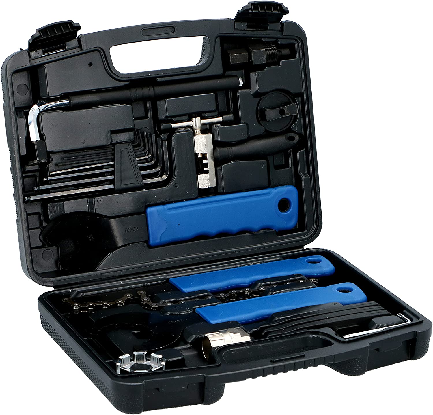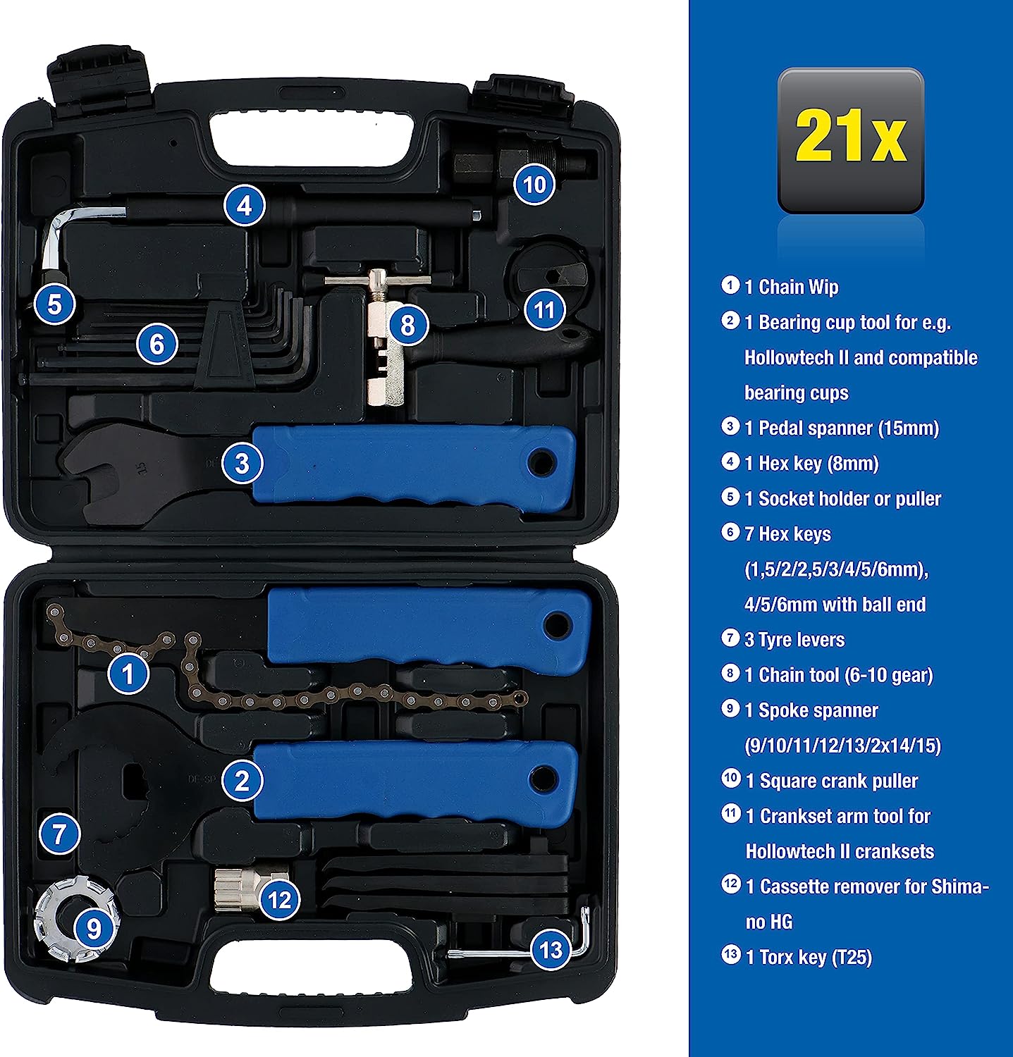 1 ключ, стик за касетиКлюч за манивела1 ключ за педали 15 мм 1 шестограмен ключ с гумирана дръжка 8 мм6 шестостенни ключа (2/2.5/3/4/5/6 мм), 4/5/6 мм със сферична глава3 лоста за гуми1 прекъсвач на веригата 1 ключ за спици (9/10/11/12/13/14/2x15)1 шлицов ключ1 ключ Torx T251 куфар