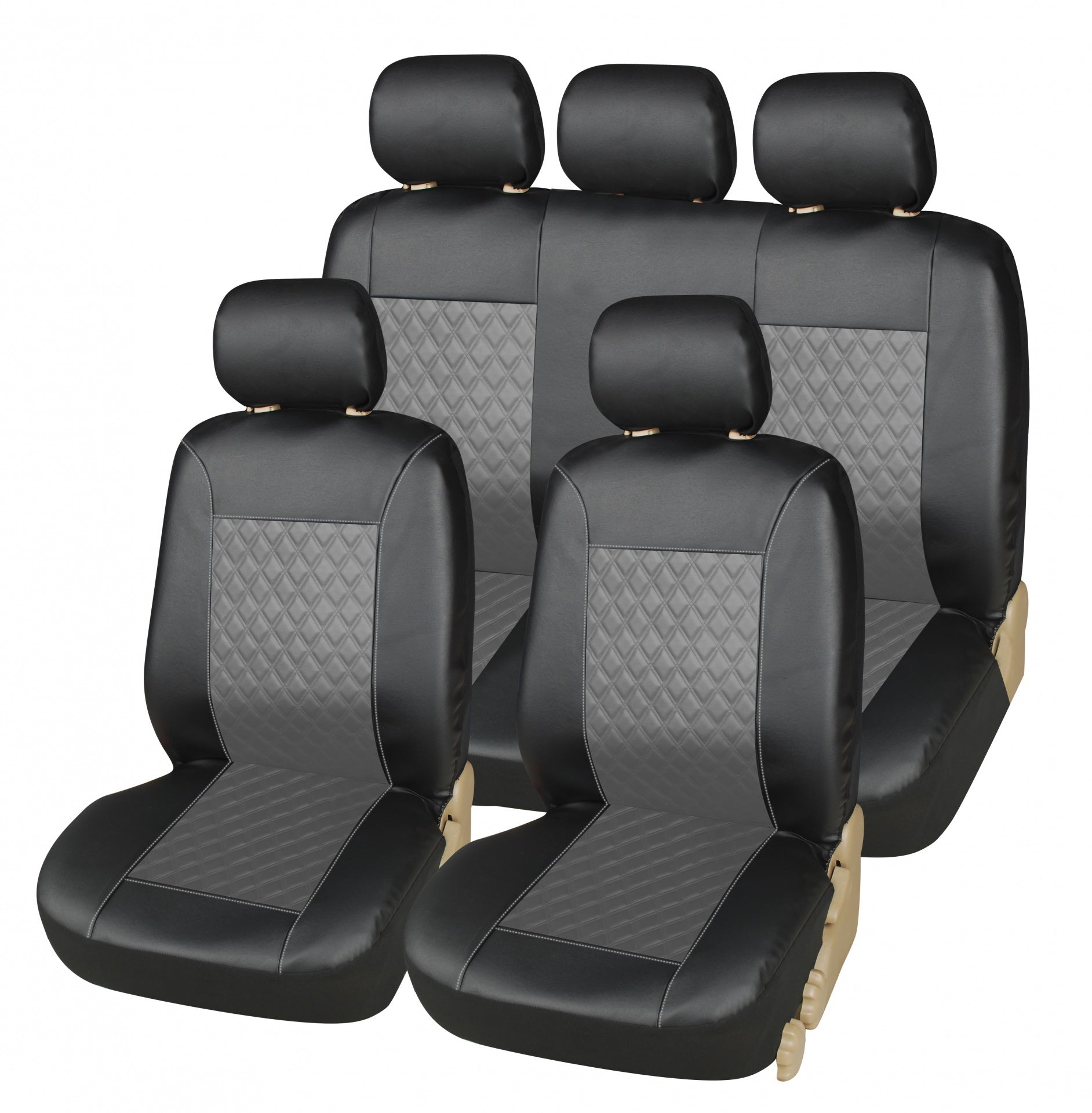 Тапицерии от еко кожа за автомобилни седалки Удобни за използване Протекторите за седалки за кола защитават седалките на вашия автомобил, като запазват оригиналната тапицерия от замърсяване и износване Създават комфортна атмосфера във вашия автомобил Изработени са от високо качествени материали Подарете си удоволствие и стил Състои се: 9 части (пълен комплект за седалки); калъфи за предни седалки; калъф за задна седалка; подглавници за седалките. Цвят: черно и сиво. Материал: еко кожа.