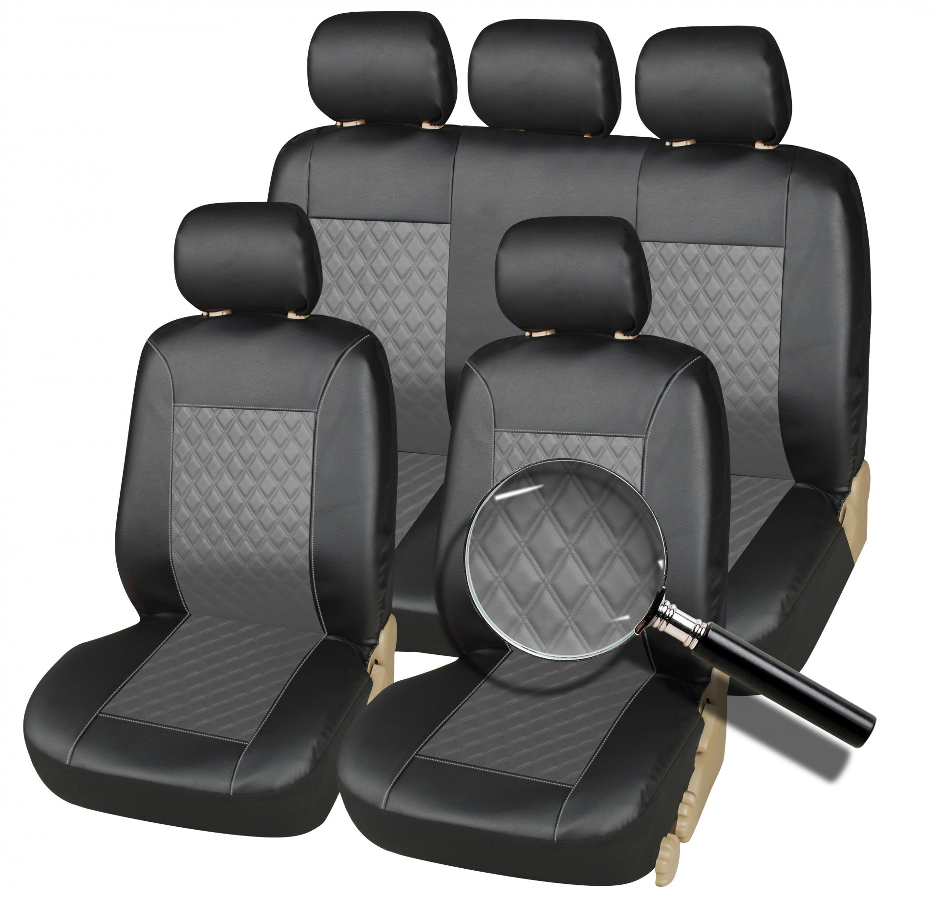 Комплект Калъфи/тапицерия за автомобил за предни и задни седалки, Еко кожа, Черно и Сиво