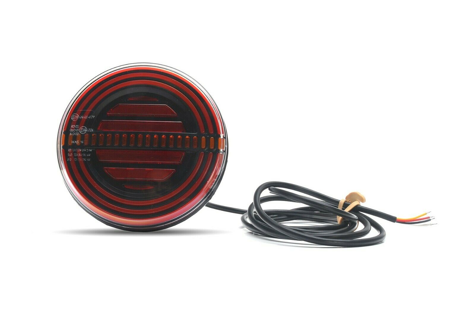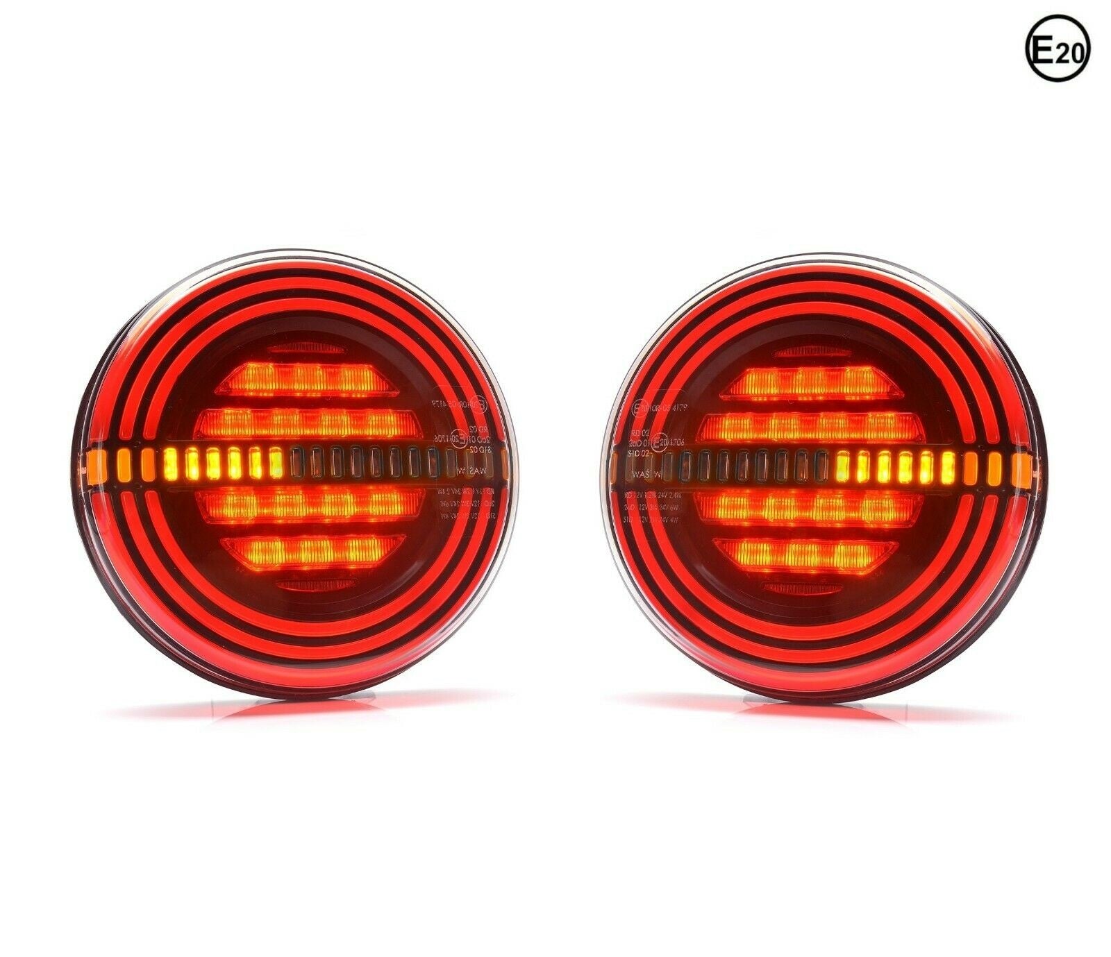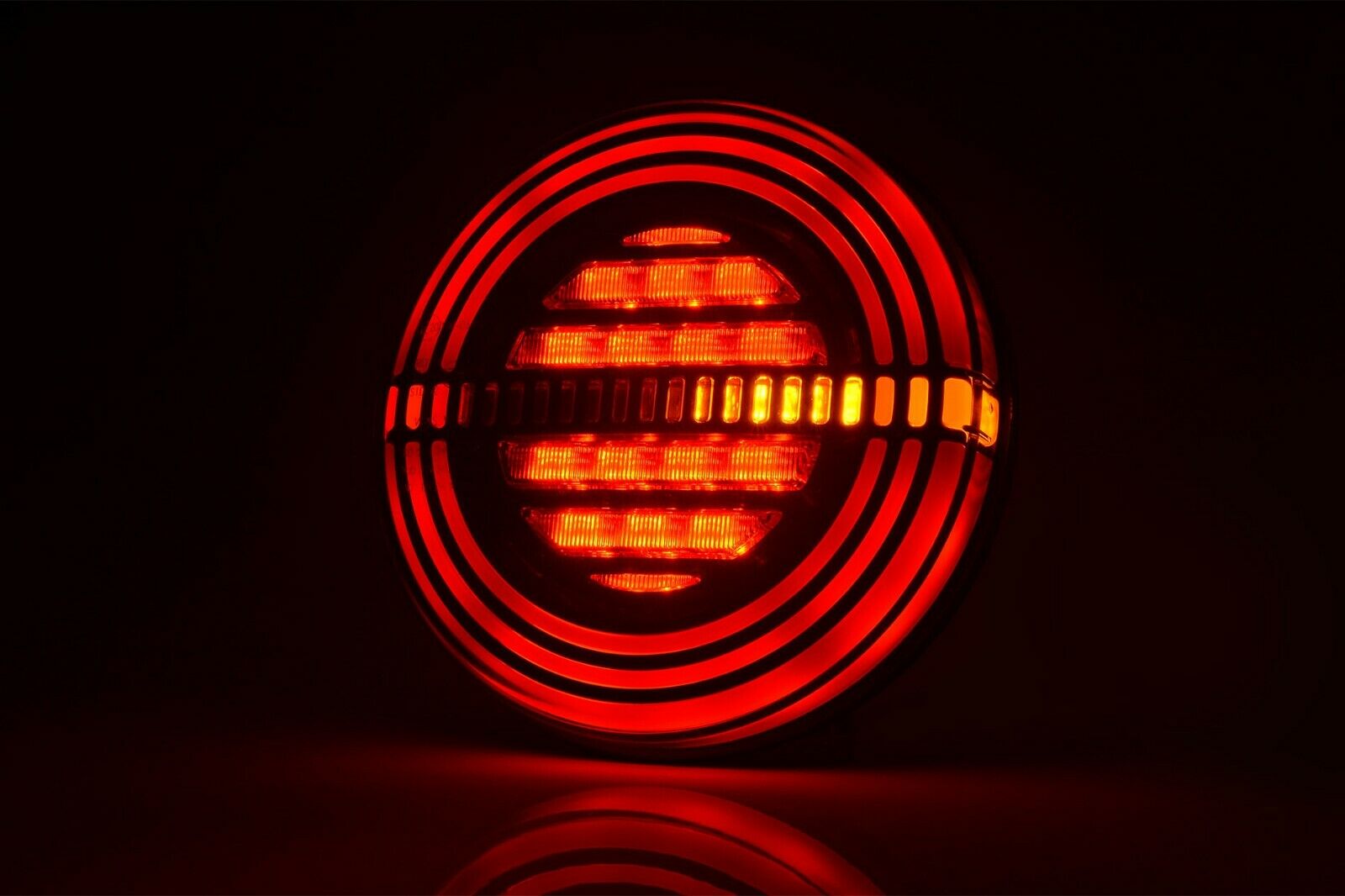 Комплект LED Светодиодни Стопове с Динамичен Бягащ Мигач WAS , Неон Ефект, Кръгли, Тип Хамбургер , Ø14.2см , 3 Функции, Е-Mark, 12V-24V