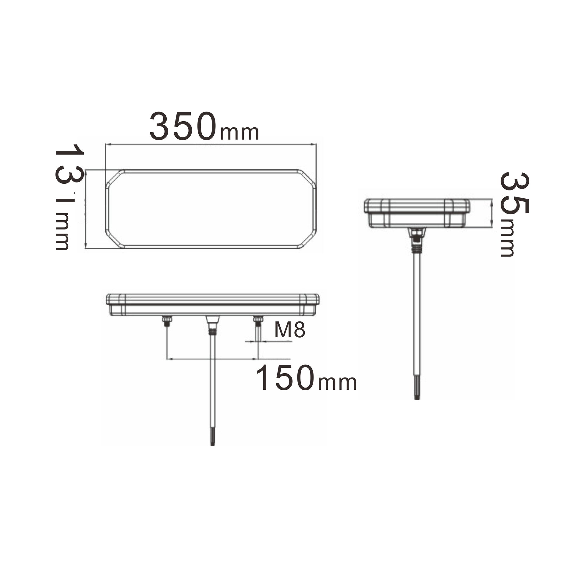 Технически характеристики: 6 Функции: *Габарит Неон *Бягащ динамичен мигач 16 LED, 6.1W *Стоп 8 LED, 1.5W *Задна Светлина 36 LED *Мъгла 8 LED, 2.6W *Рефлектор Напрежение: 12V-24V Размер: 350 X 131 X 35 MM Разстояние между монтажните отвори 150 ММ Работна температура: -40~+65C ECE R3 R6 R7 R23 R38, EMC R10, RoHS Монтаж с болтове E-Mark сертификат: E9 Водоустойчивост: IP67