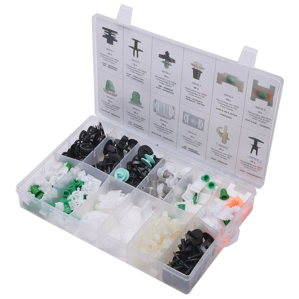 В кутията са включен 160 бр. щипки от показаните на снимката модели. Приложение : Audi Ауди Фина изработка. Изработен от висококачествен пластмасов материал, издръжлив, устойчив на износване и корозия. Лесен монтаж. Приложение: врати, броня, лайсни, подкалници, панели, табло, кори на вратите и др. Бързо и лесно премахване. Чисто нови В кутия