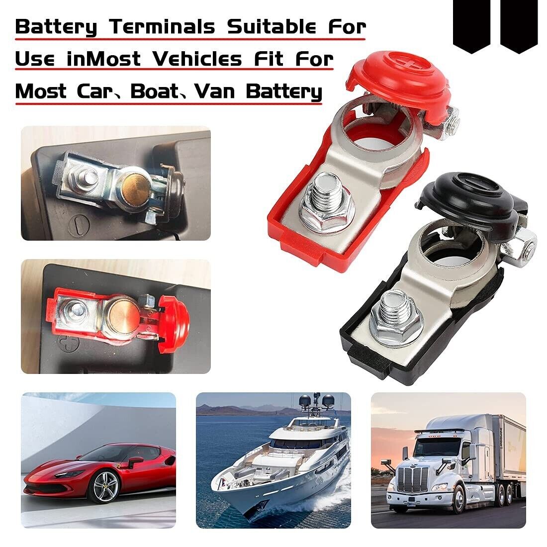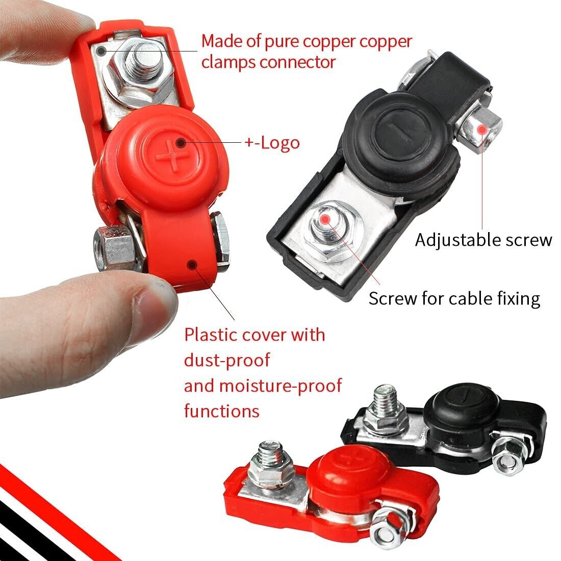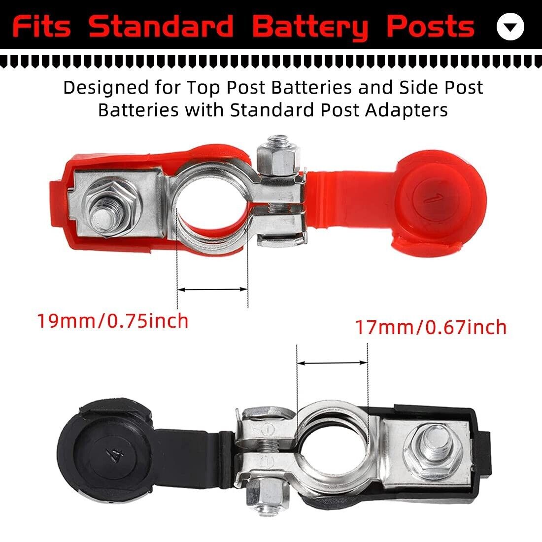 Комплект метални клеми за автомобилен акумулатор с означение: (+) , (-) Подходящи за 12 волтови акумулатори. Положителен и отрицателен полюс на батерията. С пластмасово покритие, против замърсяване и влага. Захранване към акумулаторната клема: с винт. Материал: метал. Диаметър на отвора на (+) клема 19мм, на (-) клема 17мм