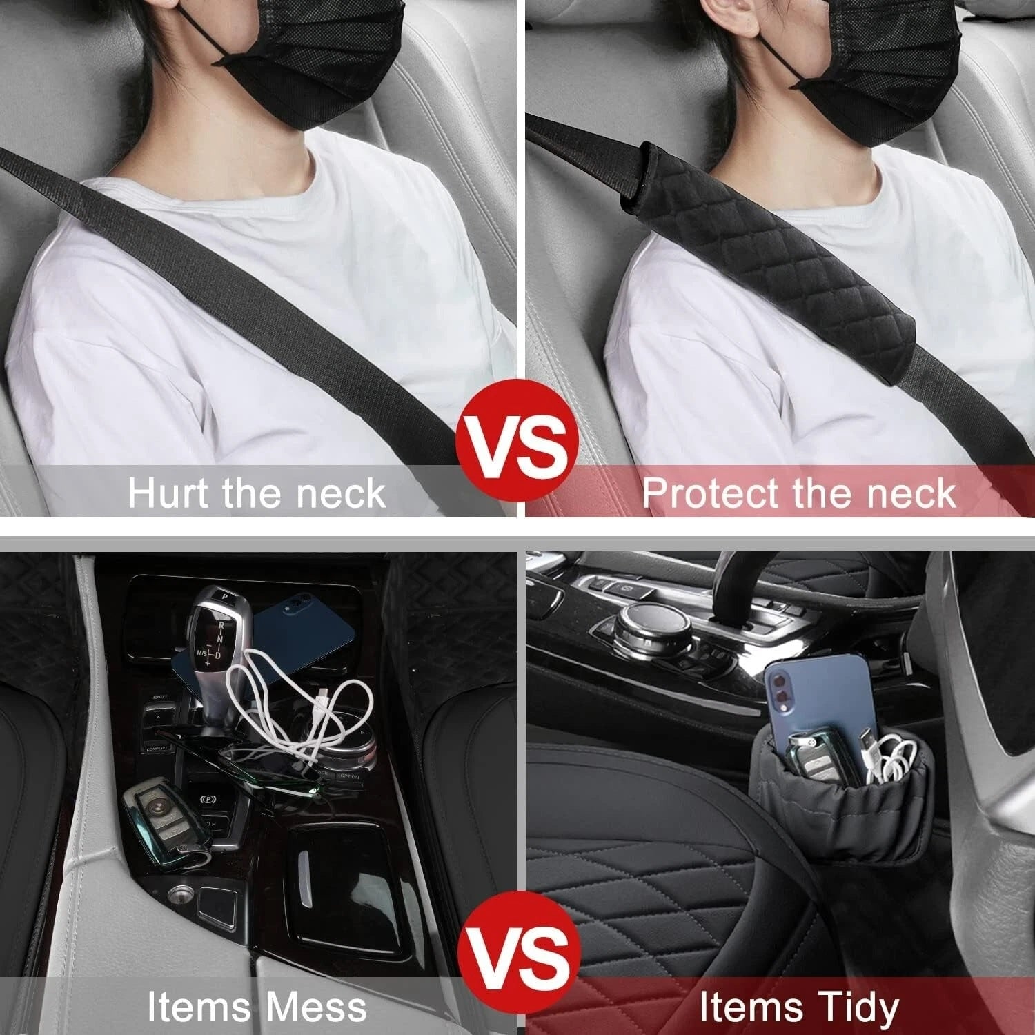 Комплект от 2 броя тапицерия, калъфи за автомобилни седалки, с джоб за съхранение и възглавници за предпазен колан, черни