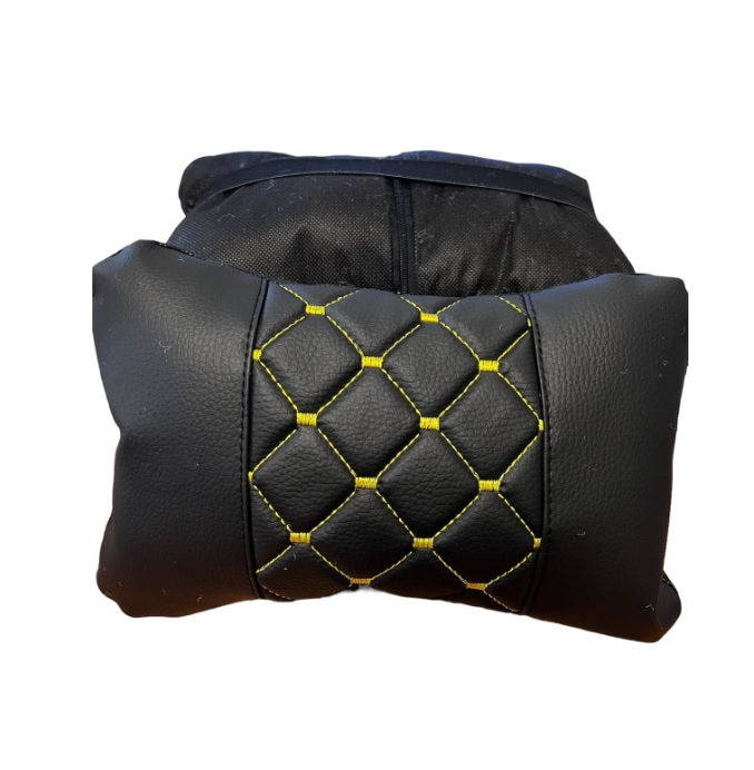 Комплект от 2 броя възглавници за врат. С тези възглавнички може да забравите за умората във врата и за натоварването на прешлените по време на път. Направете живота си по-комфортен, по-безопасен и по-здрав! Ако ежедневно прекарвате часове зад волана то този продукт е точно за вас! Меки, удобни, осигуряващи комфорт при пътуване. Подходяща както за дълги пътувания, така и за домашен релакс. Захващат се за задглавника посредством ластик. Универсален комплект за всички превозни средства и четири сезона. Материалът е мек и лесен за почистване. Ръбовете са меки и не приченяват раздразнения на кожата. С ластик. Стилен дизайн. Черно с жълт шев.