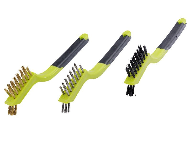 Четки за премахване на остатъци от печати, бои, лакови слоеве, лепила, етикети от стъклени и метални повърхности и почистване на тапицерия. Дължина: 180 мм Пластмасова ръкохватка Комплектът съдържа: 1бр. найлонова четка, 1бр. четка от неръждаема стомана 1бр. четка от медна тел