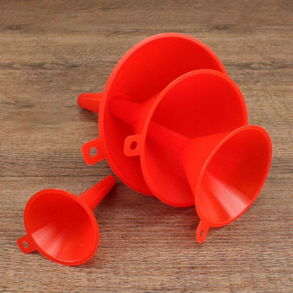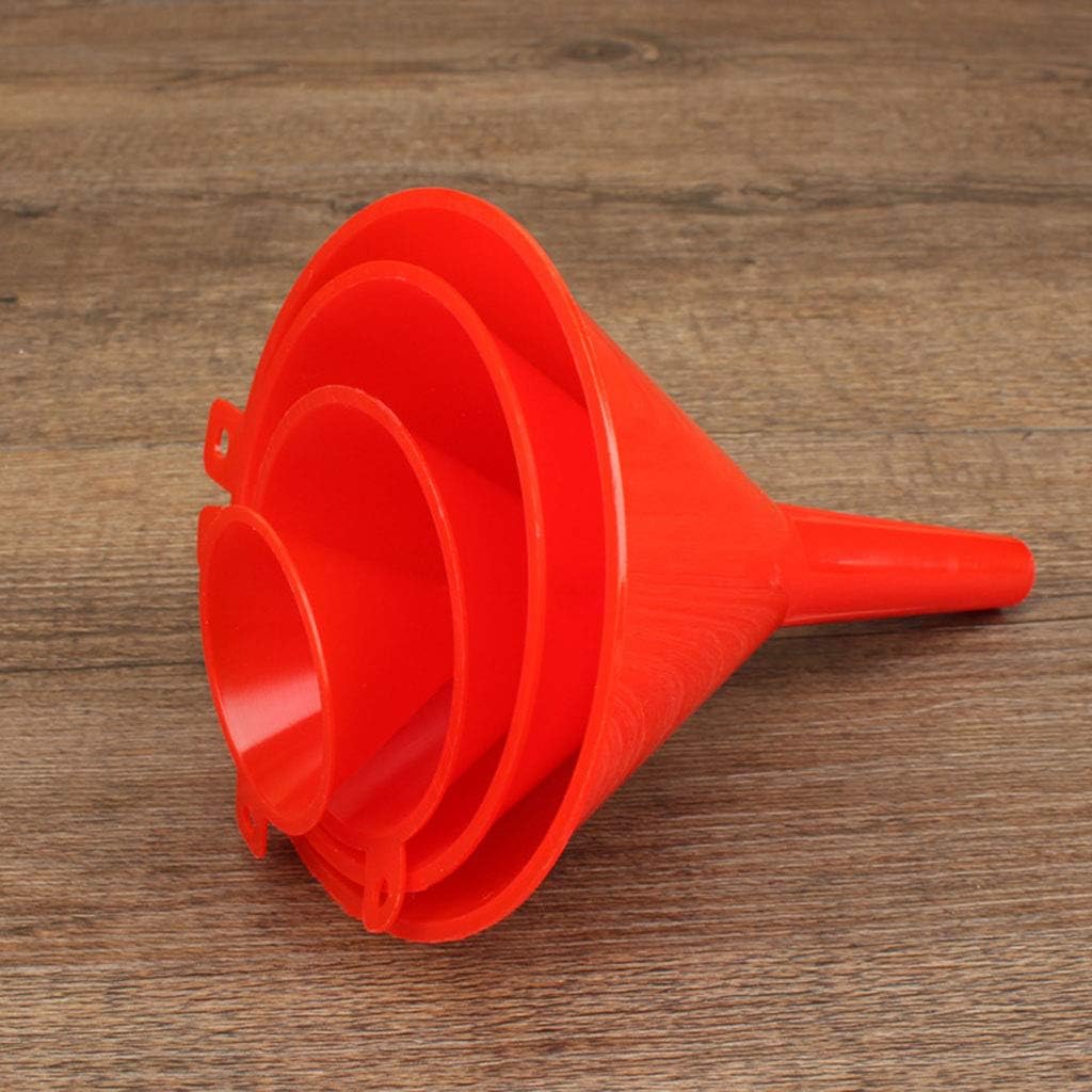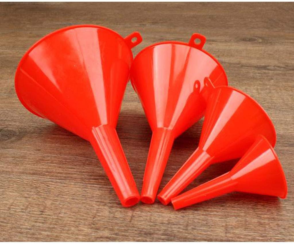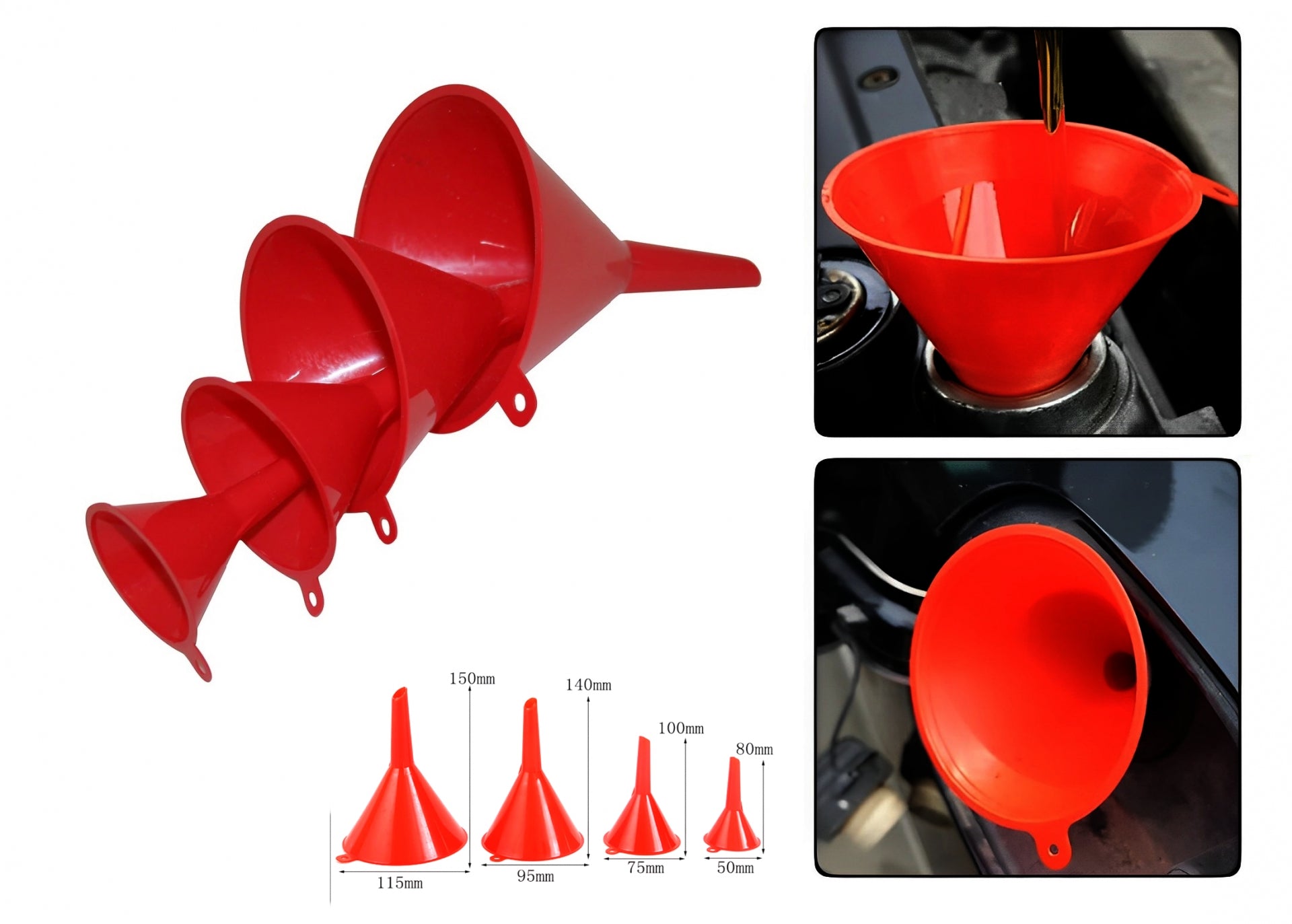 Комплект от 4 броя червени пластмасови фунии за прехвърляне на течности като гориво вода масла и др. Материал: ПВЦ Размери: 1бр: 150мм х 115мм 1бр: 140мм х 95мм 1бр: 100мм х 75мм 1бр: 80мм х 50мм