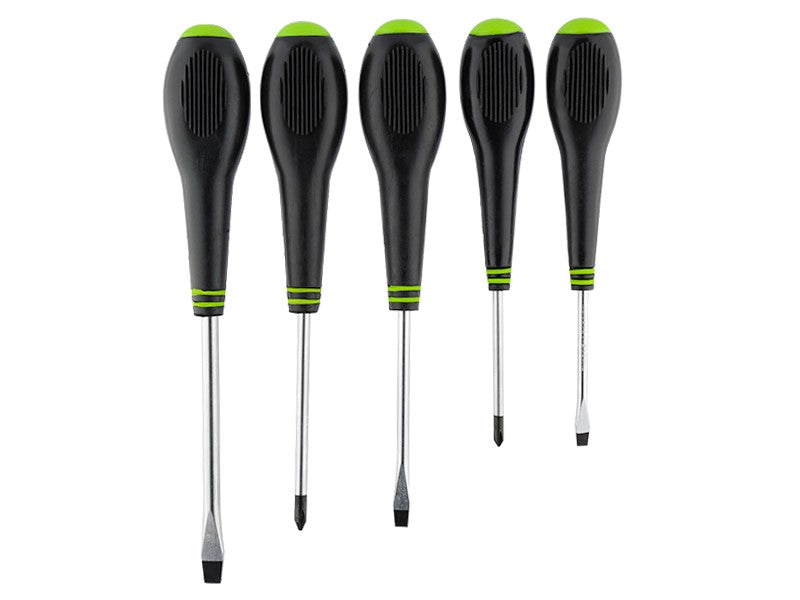 Комплект магнитни отвертки подходящи за работа с оборудване под напрежение до 1000V. Имат двукомпонентни дръжки с канали за удобен захват и максимално ефективна работа. Черният връх осигурява по-голяма точност. Остриетата са изработени от висококачествена легирана стомана. Хромирани и напълно закалени. 3 бр плоски отвертки - SL 5x75, 6x100, 8x125мм 2 бр кръстати отвертки - PH 5x75, 6x100мм