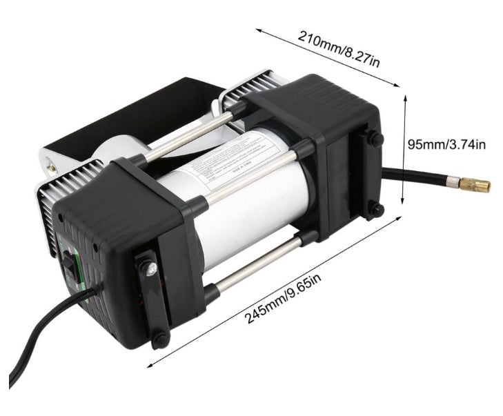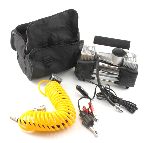 *2бр цилиндри с диаметър на 30мм *Максимално работно налягане 150PSI *Дебит на компресора 55л/мин *Пикова косумация 20А *3бр накрайници за помпене на топки дюшеци и други *Максимално време на ползване без прекъсване 20мин *Работно напрежение 12 волта 12V *Захранване -По избор директно от акумулатора с щипки или в запалката на автомобила *Захранващ Кабел 3 метра *Спираловиден маркуч за помпене с манометър лесно сваляем с бърза връзка-5 метра *Практична чантичка за съхранение