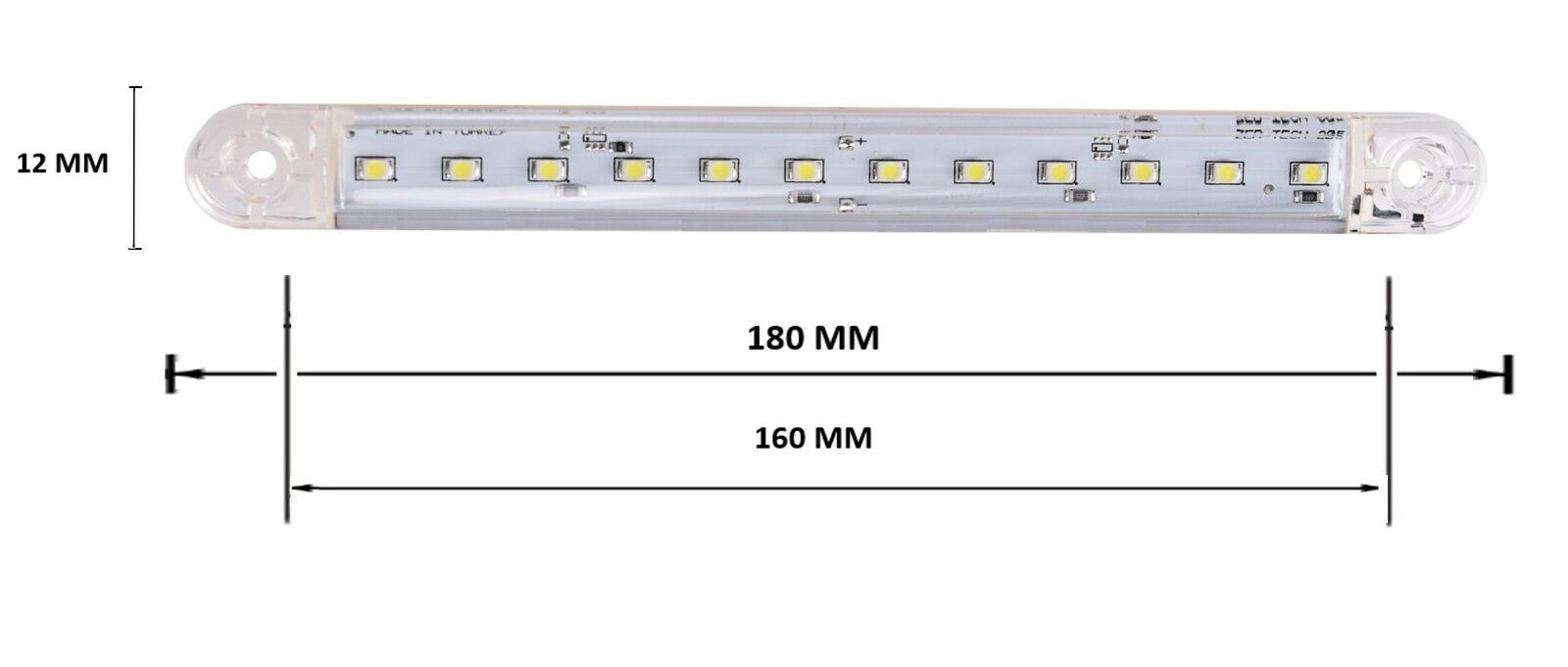 ЛЕД LED Бял Диоден Маркер Габарит Токос със 6 светодиода за камион ремарке бус ван 12V-24V С ниска консумация Удароустойчив Водоустойчив Некорозивен корпус Материал: ABS пластмаса Цвят: Бял Размер : Дължина: 180 мм Ширина: 12 мм Дебелина: 10 мм Разстояние между монтажните отвори: 160 мм Лесен за монтаж с посък гръб ПОДХОДЯЩ ЗА ВСИЧКИ АВТОМОБИЛИ С 12V И 24V