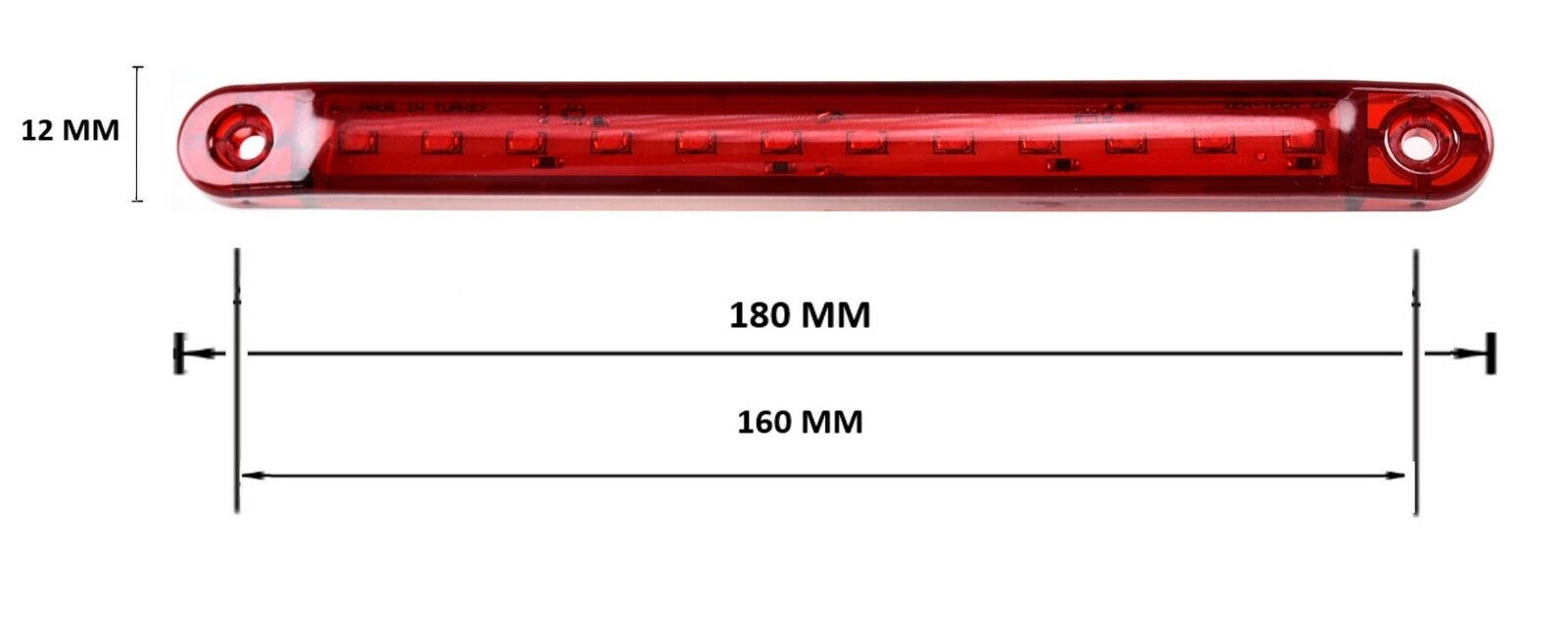 ЛЕД LED Червен Диоден Маркер Габарит Токос със 6 светодиода за камион ремарке бус ван 12V-24V С ниска консумация Удароустойчив Водоустойчив Некорозивен корпус Материал: ABS пластмаса Цвят: Червен Размер : Дължина: 180 мм Ширина: 12 мм Дебелина: 10 мм Разстояние между монтажните отвори: 160 мм Лесен за монтаж с посък гръб ПОДХОДЯЩ ЗА ВСИЧКИ АВТОМОБИЛИ С 12V И 24V