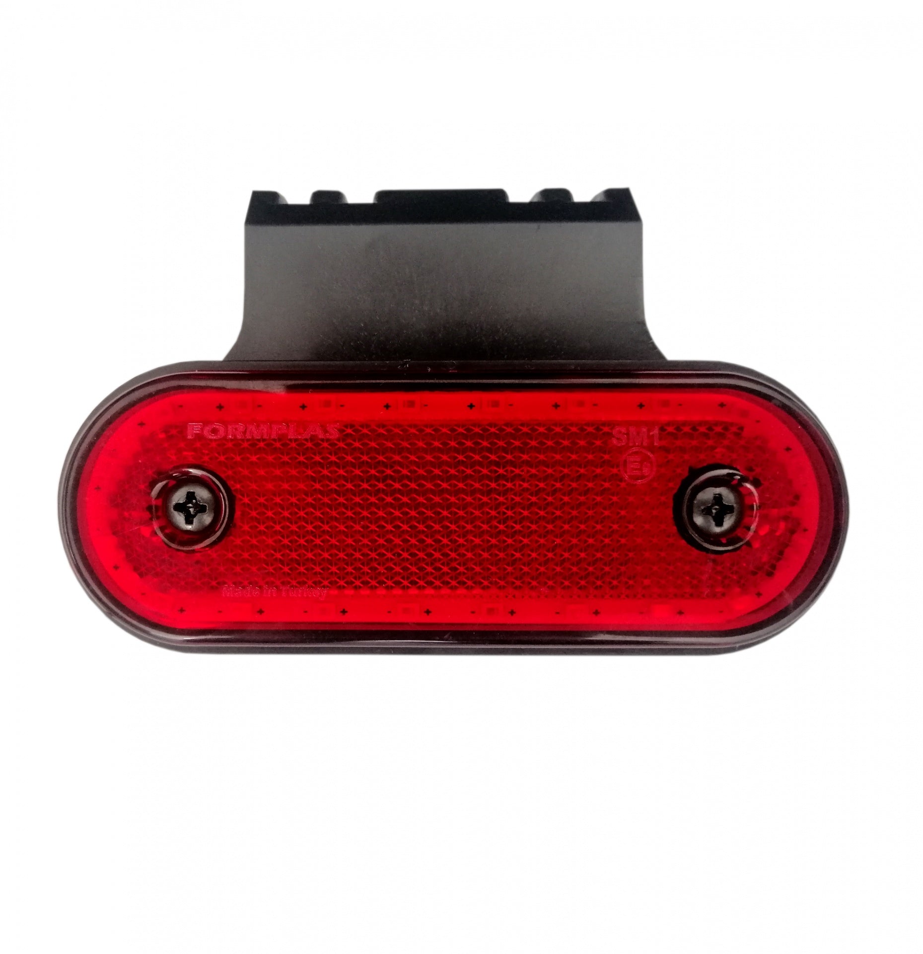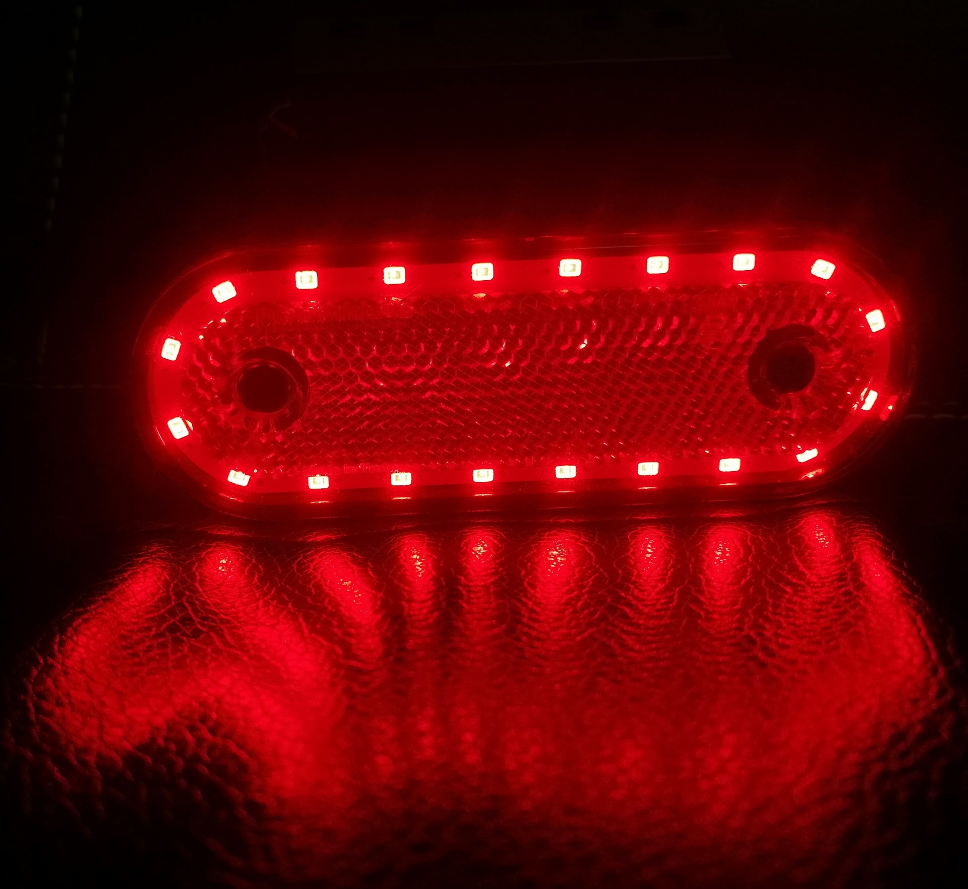 Технически подробности: Овална форма със стойка Размери 110x35mm (разстояние между отворите 70mm) Дебелина 14mm Жълт червен Устойчивост на всякакви атмосферни условия. Работна температура - 40C до +55C. Работи от 12V до 24V; Осветление 20 светодиода Скоба за странично закрепване Захранващ кабел Лампата, когато не е захранена, има функцията на рефлектор