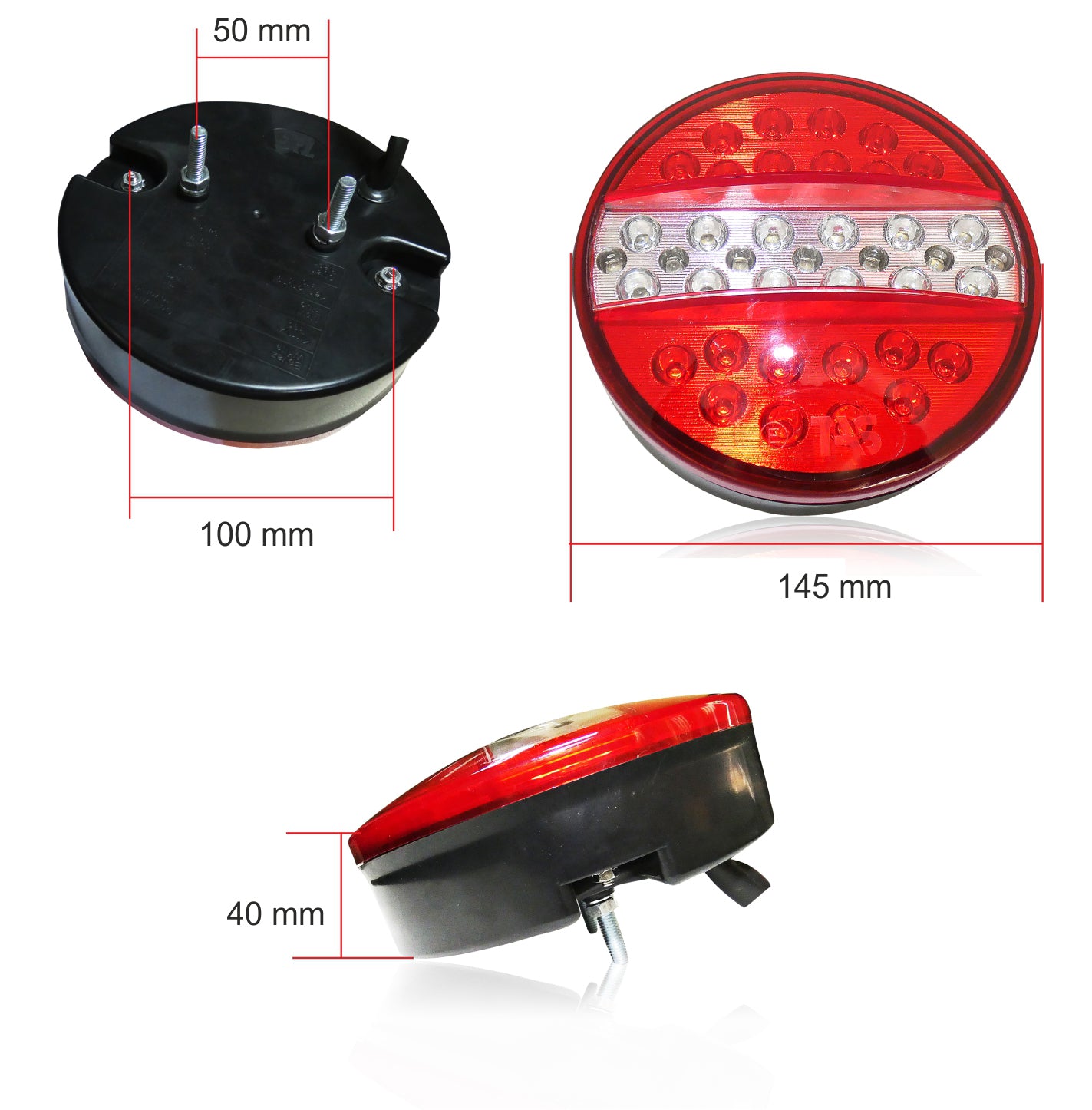 4 функции: стоп светлина, мигач, габарит и светлина за заден ход. Подходящи за камион, бус, ремарке и др. Подходящи за 12 волтови системи. Устойчиви на прах и вода. Размери: Диаметър: 140мм Ширина: 40мм Междуболтово разстояние - 50мм