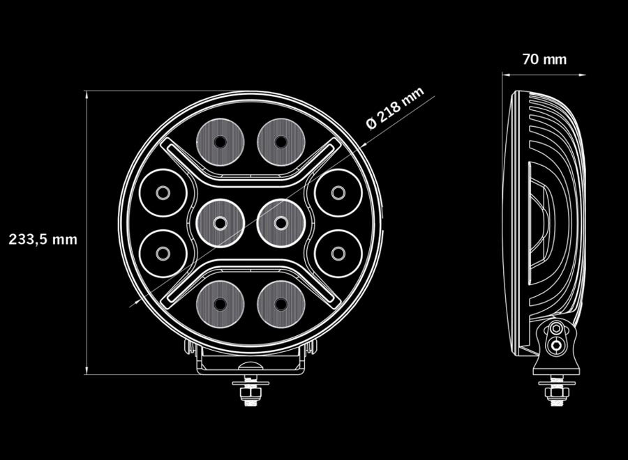 Бяла светлина PCS LED: 10 ЛЕД Оранжева габаритна светлинаPCS LED : 4 ЛЕД Напрежение (V DC) 9-36V DC (w) 12V 150 Консумация (w) 12V 125 Консумация (w) 24V 115 Лумени 14000 Келвин 6000 Водоустойчив: IP68 IP69K Цвят на корпуса Черен Цвят на лещиата Прозрачен Цветни светодиоди Бял и Оранжев/Жълт Комбиниран модел на лъча Дължина на кабела (mm) 500 Материал на скобата - Неръждаема стомана Материал на лещата - Поликарбонат Дълбочина (mm) 70 Височина със скоба (мм) 233,5 Работна температура -40C +60C Черен кабел (Отрицателен) Червен кабел + (положителен) Бял кабел + бяла габаритна светлина (положителна) Жълт кабел + жълта габаритна светлина (положителна) Пакетът включва: 9 Led светлина Винтове и скоби