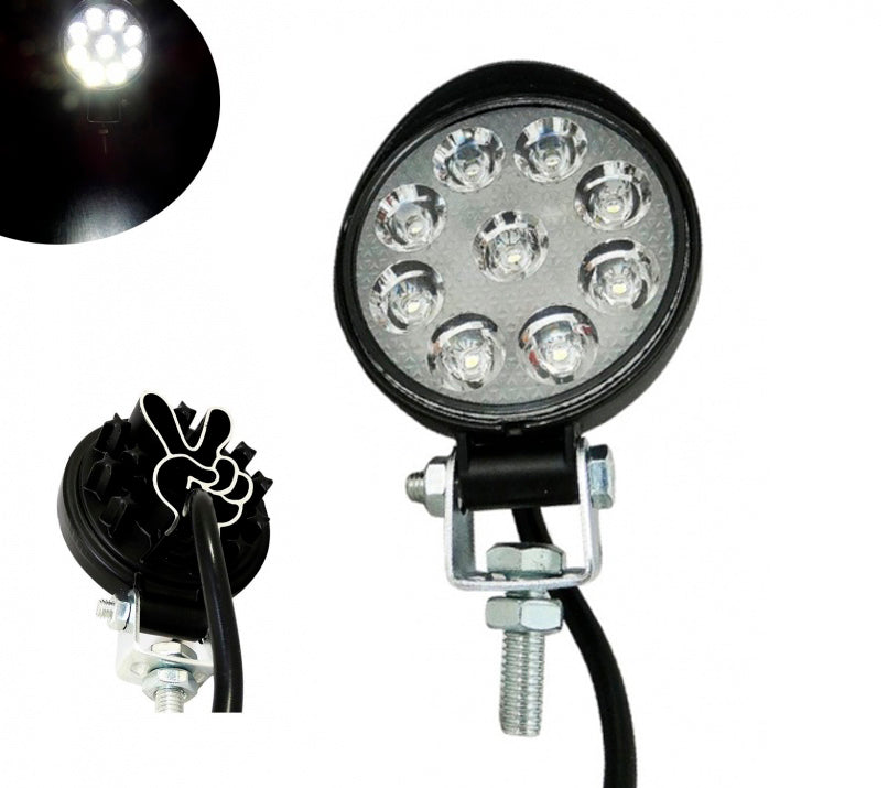 Ярка Работна Лампа, Подходяща за Халогени и Дневни Светлини Устойчива на вода, удари и вибрации. Алуминиево тяло за по-добра устойчивост от нагряване. Метални скоби за монтиране. 30 градуса ъгъл на осветяване Над 30000 часа живот. Работна температура от -25 до +65. Мощност: 27W (9 Х 3W) Захранване - 10-30V DC Цвят на осветление: БЯЛ 6000K-6500K Размери: Диаметър: 75 мм Височина Със Скобата: 110 Дебелина: 30 мм