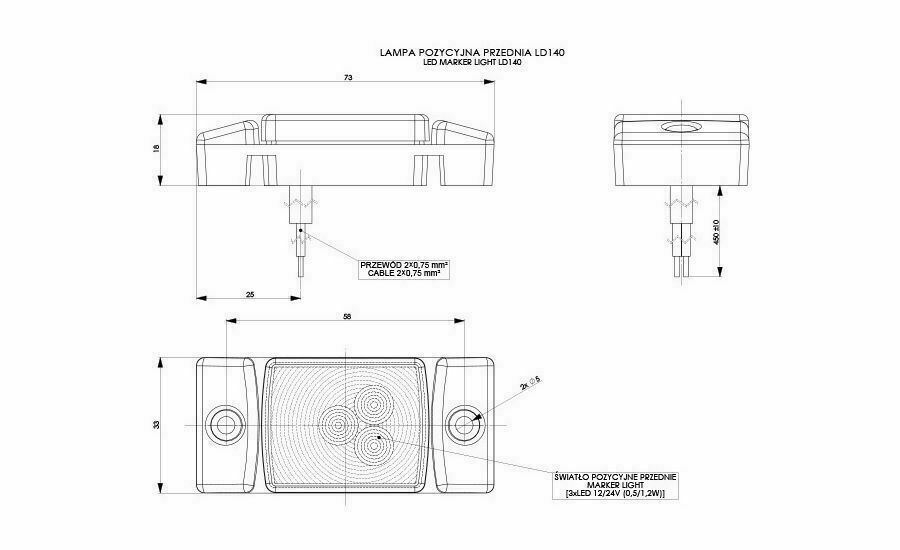 LED Светодиоден Габарит, Маркер, Токос, Бял, Правоъгълна форма, Е-Mark, 3 LED, 12V-24V, 8 см подходящ за всякакви камиони, бусове, каравани, ремаркета и полуремаркета, селскостопански машини, платформи за лодки и мотори, строителна техника и др. ПРОИЗВОДИТЕЛ: HORPOL Полша Вертикален или Хоризонтален монтаж Размери: 73мм x 33мм x 18мм Разстояние между монтажните отвори: 58мм Напрежение : 12V / 24V Евро сертификат : E20 Клас на защита: IP66/68 Цвят на светлината: Бял ISO 9001:2008