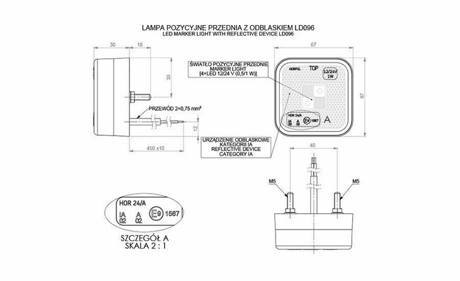 LED Светодиоден Габарит, Светлоотразителен, Стоп, Маркер, Токос, Червен, Е-Mark, 4 LED, 12V-24V, 6.7 см подходящ за всякакви камиони, бусове, каравани, ремаркета и полуремаркета, селскостопански машини, платформи за лодки и мотори, строителна техника и др. ПРОИЗВОДИТЕЛ: HORPOL Полша Вертикален или Хоризонтален монтаж Размери: 67мм x 67мм x 30мм Разстояние между монтажните отвори: 40мм Напрежение : 12V / 24V Евро сертификат : E9 Клас на защита: IP66/68 Цвят на светлината: Червен
