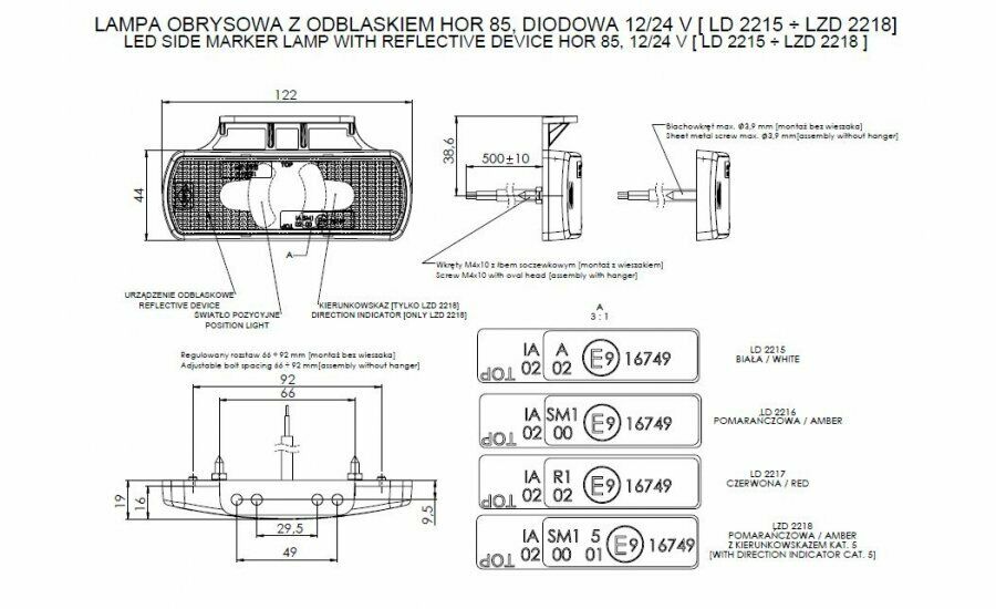 LED Светодиоден Мигач, Габарит, Маркер, Оранжев, Вграден Рефлектор, Е-Mark, Водоустойчив, 12V-24V Производител: HORPOL - Полша *E-Mark Е9 *Напрежение: 12V и 24V (мулти волтаж) *Ниска консумация на енергия *Дълъг живот 50 000ч *Степен на водоустойчивост: IP 68 *Светодиоди Цвят: 4x оранжев / жълт *Номинална мощност 12V -0,6W *Номинална мощност 24V -1,2W Размери: *Височина: 44 мм *Дължина: 122 мм *Дължина на кабела: 500 мм *Разстояние между монтажните отвори: от 66 мм до 92 мм