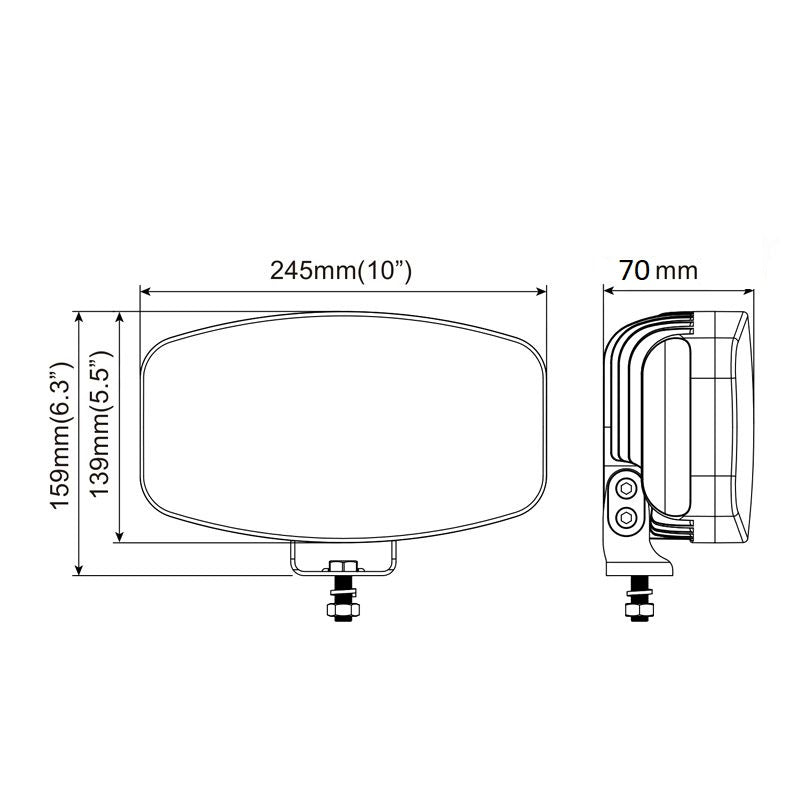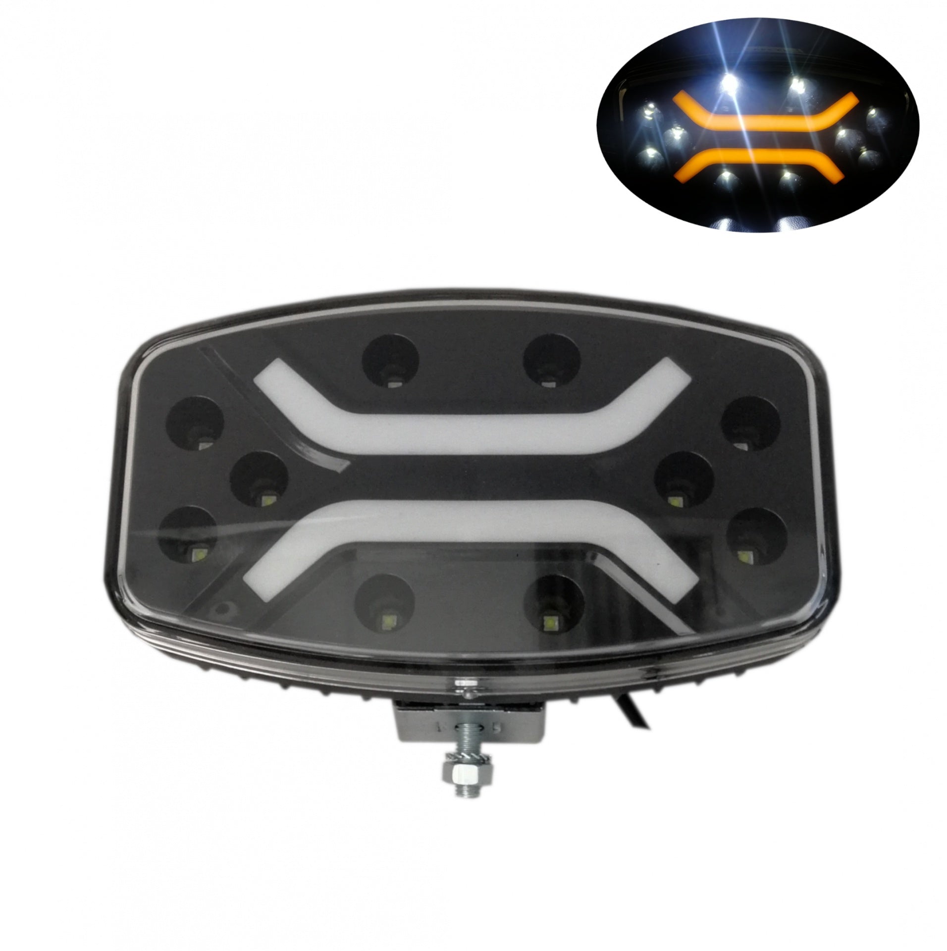 Високомощен и издръжлив Устойчива на вода IP67 , удари и вибрации. Сертификат: ECE R148, Р149, R10, Е9 Работно напрежение12 - 24V Светодиоди SMD LED 10 + 24 Модел на лъча Спот Концентрирана светлина Работна температура от -40 до +85. Материал на корпуса Алуминий Материал на скобата Неръждаема стомана Материал на обектива PC Размери : 245 x 139 x 70 mm Цвят: бяло-жълто