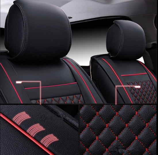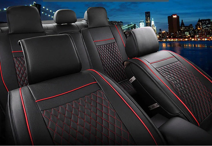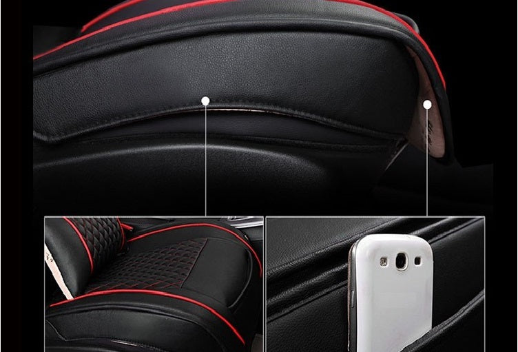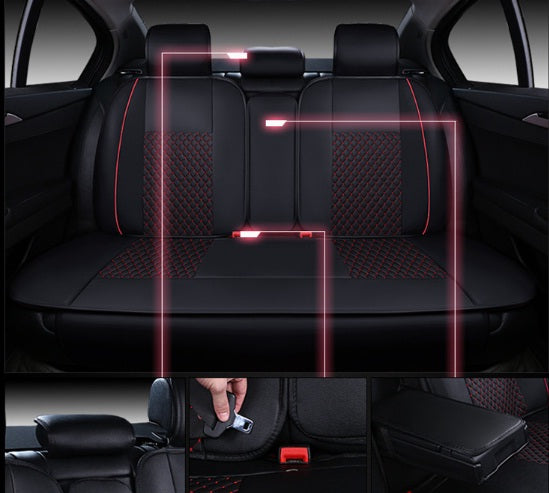 Висококачествена пълен комплект черна тапицерия от изкуствена кожа, кожена бродерия с червени цветове. Луксозна тапицерия Изработени от висококачествена PU изкуствена кожа и мека пяна, осигуряват удобно чувство за сядане. Ръчно шити. Универсален дизайн, подходящ за всички автомобили. Дизайн, съвместим с airbag - въздушни възглавници. Устойчивост на износване, добър водоустойчив ефект и силна огнезащитна способност. Лесна инсталация. Цялостен дизайн, покрива предната и задната част на седалката. Пакет, включващ: 5 части