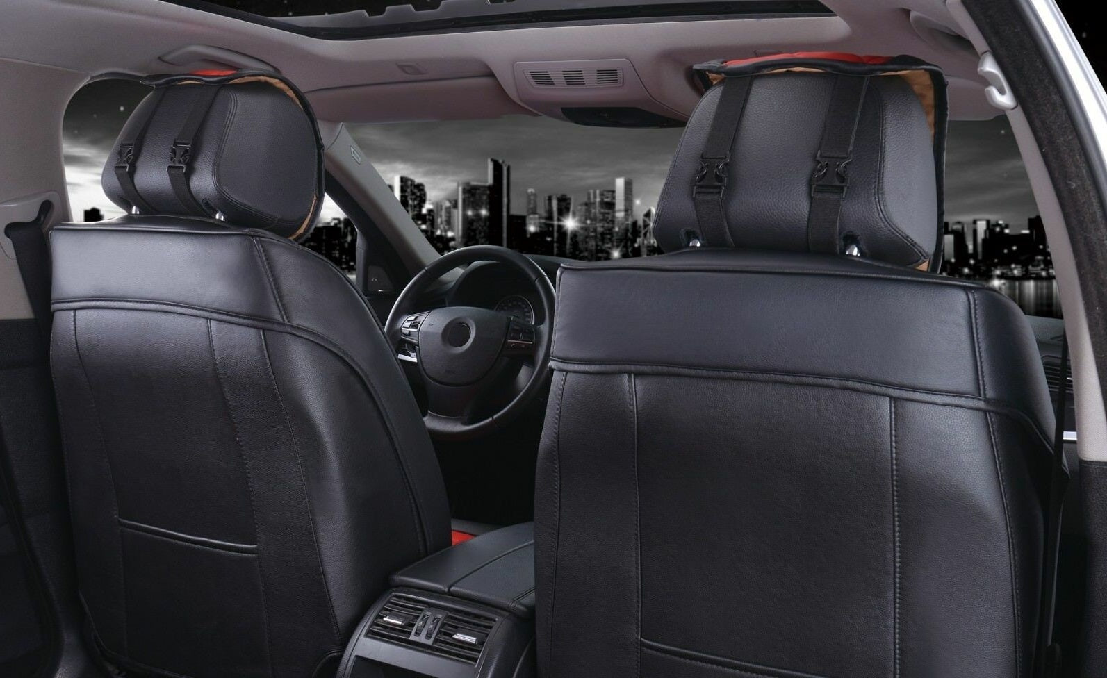 Висококачествена черна тапицерия от изкуствена кожа, кожена бродерия на предните седалки. Луксозна тапицерия Изработени от висококачествена PU изкуствена кожа и мека пяна, осигуряват удобно чувство за сядане. Универсален дизайн, подходящ за всички автомобили. Дизайн, съвместим с airbag - въздушни възглавници. Устойчивост на износване, добър водоустойчив ефект и силна огнезащитна способност. Лесна инсталация. Цялостен дизайн, покрива предната и задната част на седалката. Пакет, включващ: 2 предни калъфа за седалки