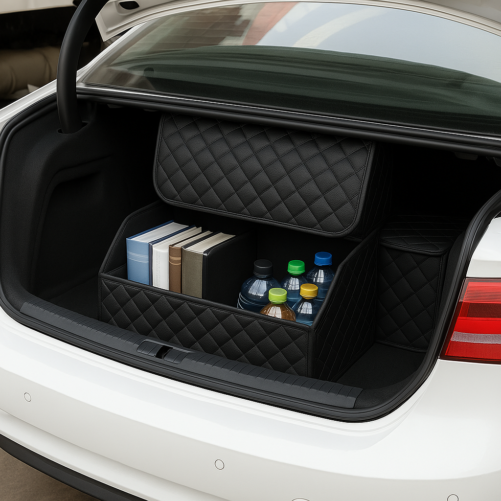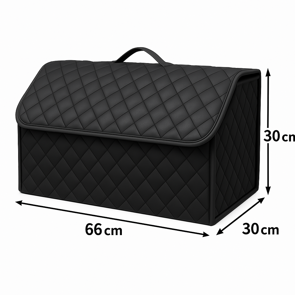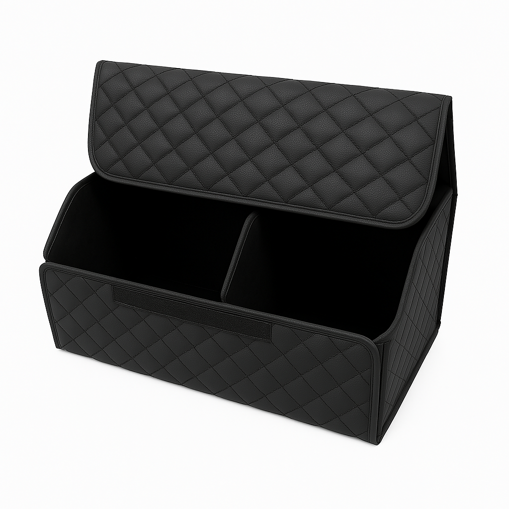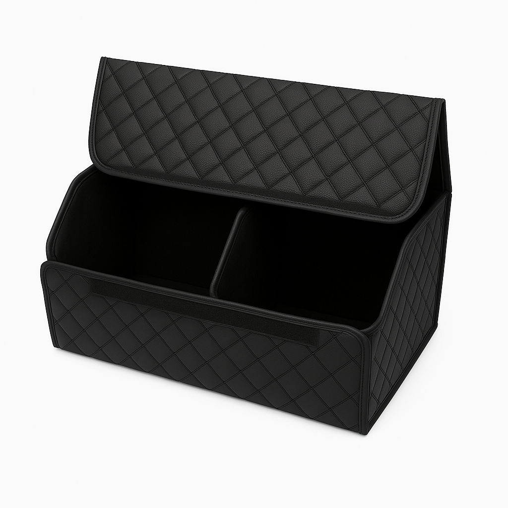 Този висококачествен органайзер за багажник от издръжлива еко кожа съчетава стил, функционалност и практичност. Със своя елегантен дизайн, той поддържа автомобила ви подреден и придава премиум излъчване.Разполага с просторно вътрешно отделение с разделители, което го прави идеален за съхранение и организиране на аксесоари, инструменти, напитки, книги и други принадлежности.
