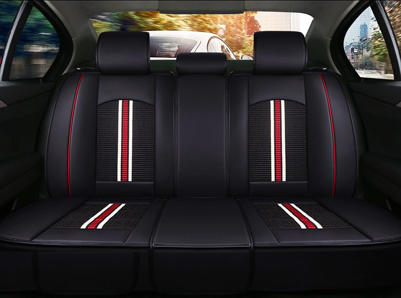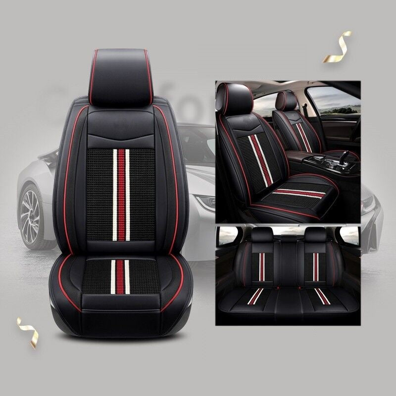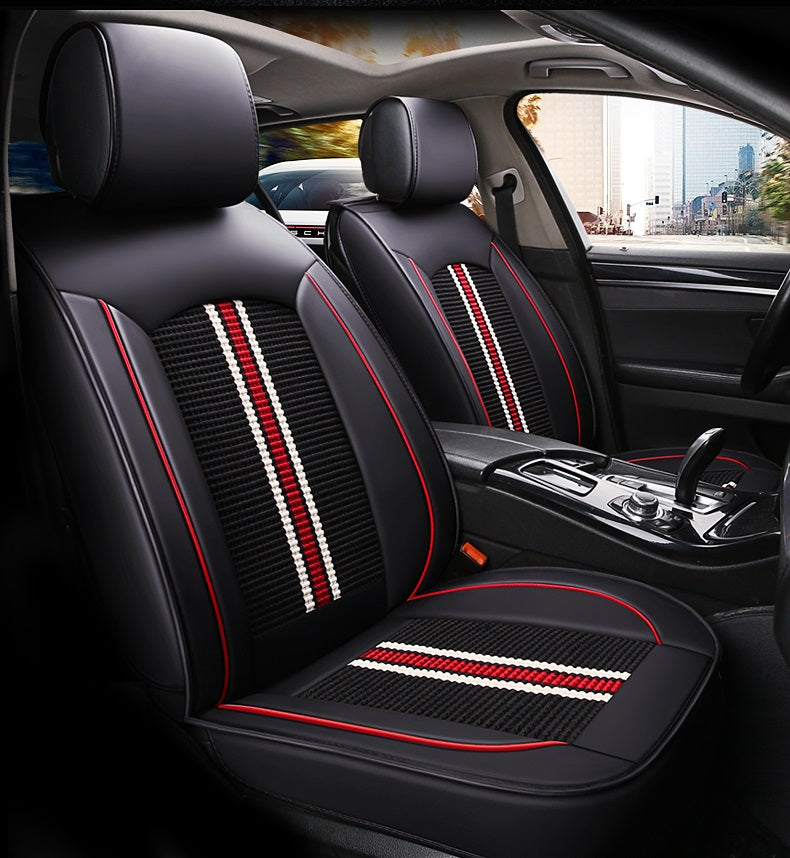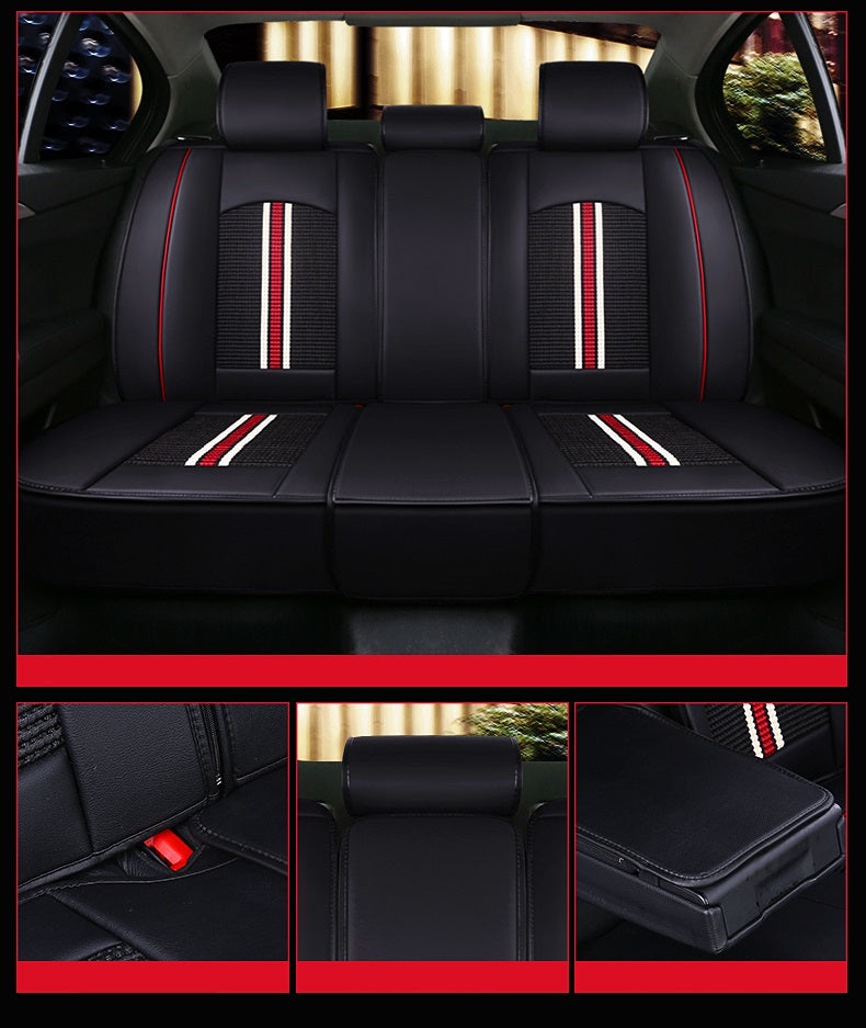 Висококачествена пълен комплект черна тапицерия от изкуствена кожа и плат с червени-бели цветове. Луксозна тапицерия Изработени от висококачествена PU изкусвена кожа и мека пяна, осигуряват удобно чувство за сядане. Ръчно шити. Универсален дизайн, подходящ за всички автомобили. Дизайн, съвместим с airbag - въздушни възглавници. Устойчивост на износване, добър водоустойчив ефект и силна огнезащитна способност. Лесна инсталация. Цялостен дизайн, покрива предната и задната част на седалката. Пакет, включващ: 9 части, предни и задни.