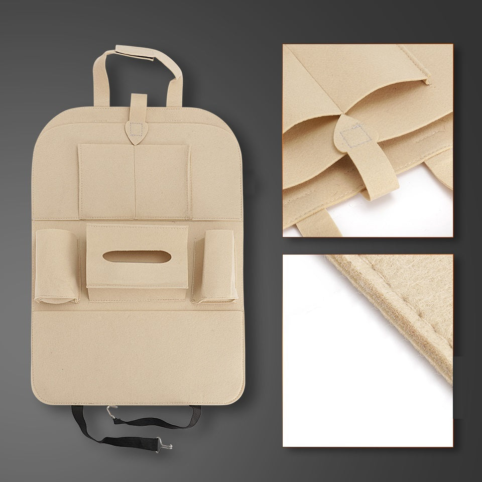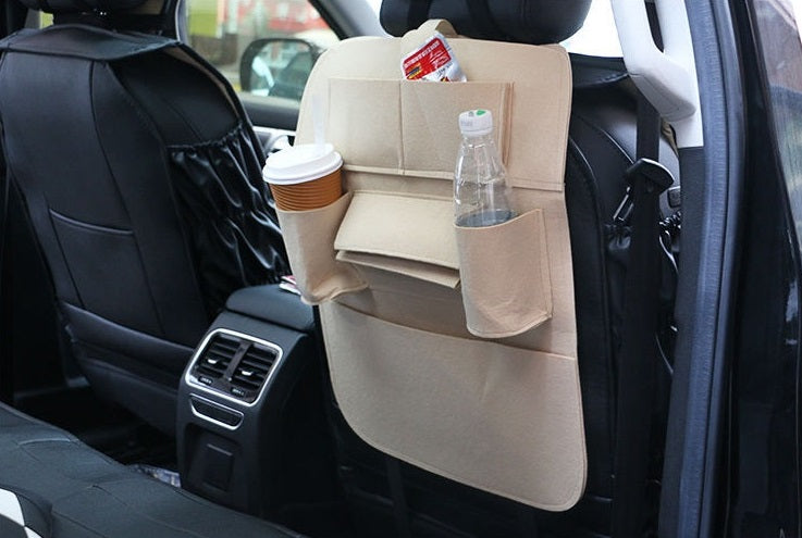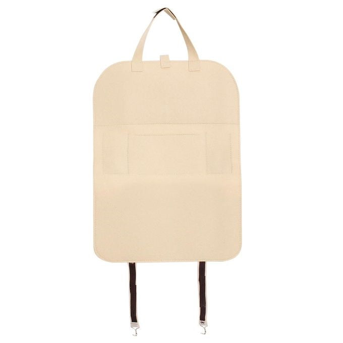 Универсален Бежов Органайзер за Автомобилна Седалка 2 Функции: Предпазва от следи по гърба на предната седалка, лесен и удобен органайзер Изработен от качествени и издръжливи материали 6 Джоба: два джоба за напитки, голям джоб с още два по-малки джоба прикрепени към него, голям джоб за кутия за салфетки Съвместим с повечето автомобили, лесна изнталация. Размери: Височина 54.5 см Ширина: 40 см