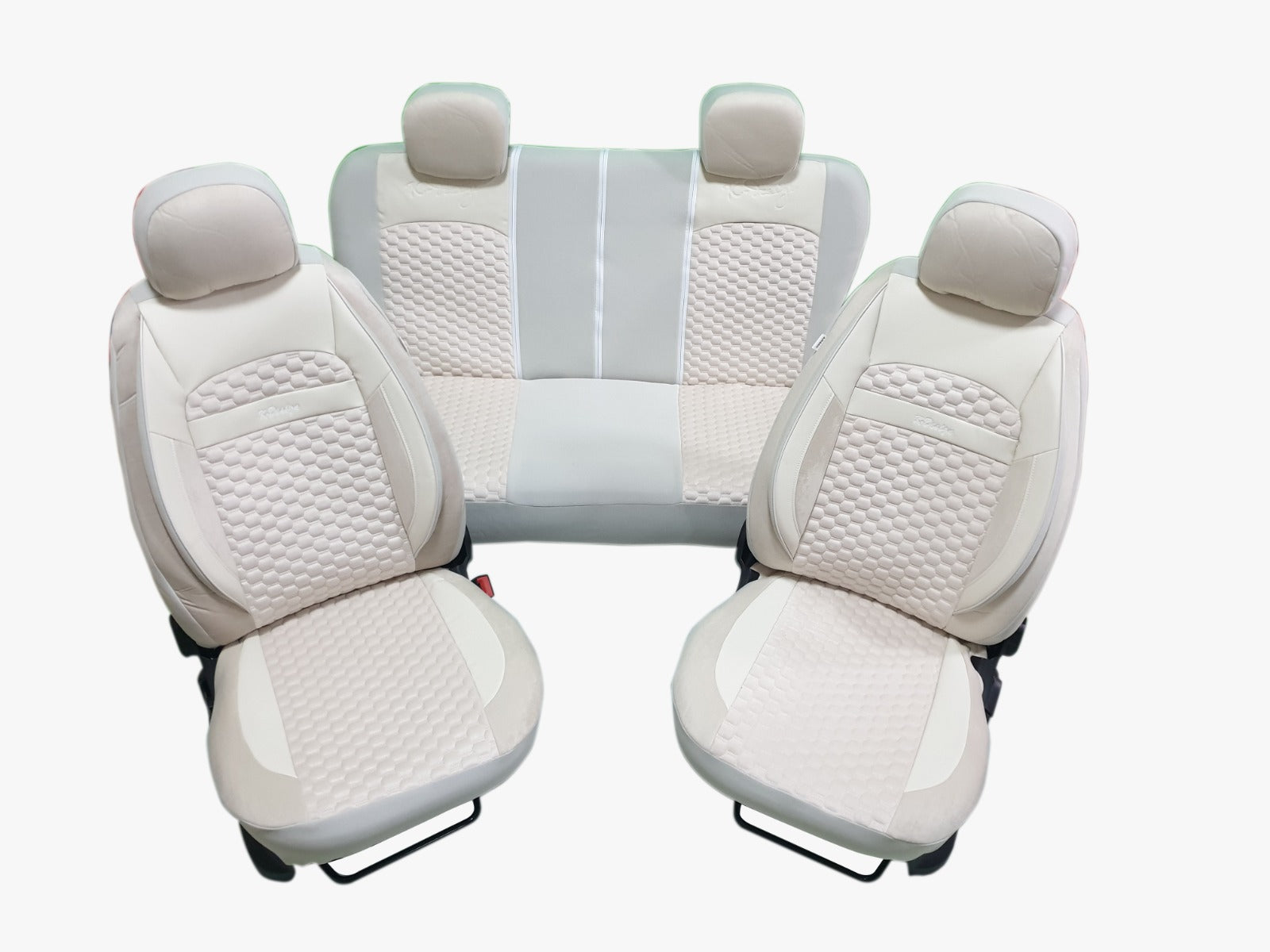 Пълен комплект DELUXE тапицерия/калъфи от еко кожа и текстил - / бежово и бяло / - Пълен комплект: Шофьорска седалка, пасажерска седалка и задна седалка. Комплектът включва: 1 x калъф за шофьорската седалка 1 x калъф за пасажерска седалка 1 х калъф за задна седалка 4 x калъфи за облегалки за глава * подходящи за автомобили с ляв и десен волан * Бързо и лесно монтиране - просто поставете върху оригиналните седалки и изпънете (с ластици отдолу, така, че да се изпъват сегнато по седалките) * Подходящи са за автомобили с въздушни възглавници и могат да се ползват с подлакътник. * Лесно почистване - просто забършете. * Ушити от качествен текстил и еко кожа. - Тези калъфи са предназначени да предпазят вашата оригинална тапицерия от замърсяване и износване. - Дори редовно почистване не може да спре ежедневното износване. - Защитете оригиналната тапицерия на автомобила си. За въпроси може да ни потърсите на посочения телефон в работно време.
