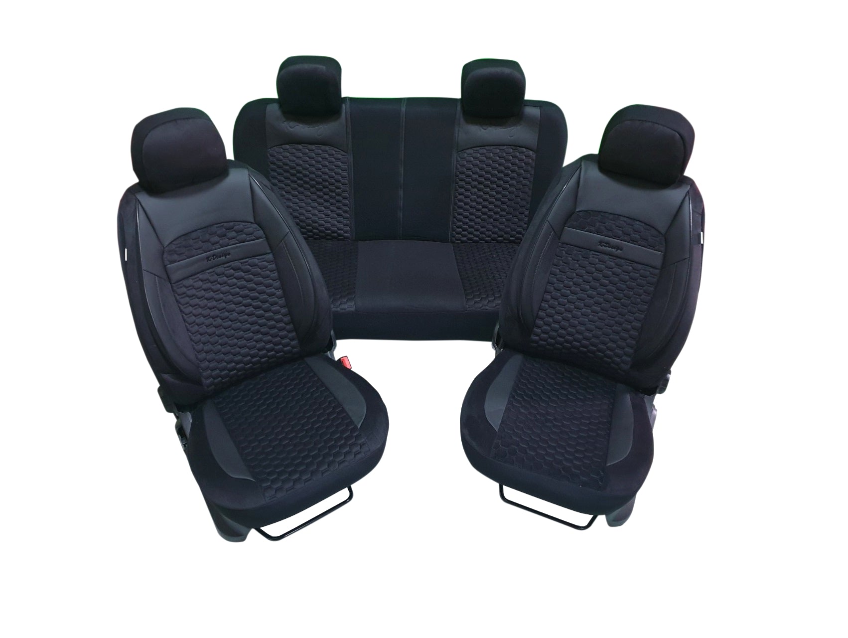 Пълен комплект DELUXE тапицерия/калъфи от еко кожа и текстил / черно / Съвместими с 99% от автомобилите със стандартни седалки. Изработени от качествени устойчиви на износване материали. Запазват оригиналната тапицерия от зацапване и износване. Съвместими със седалки с вградени въздушни възглавници. Закрепя се под седалката с метални ластици и кукички, стои изпънато. Комплектът съдържа калъфи за: Предни седалки Задни седалки Облегалки за глава