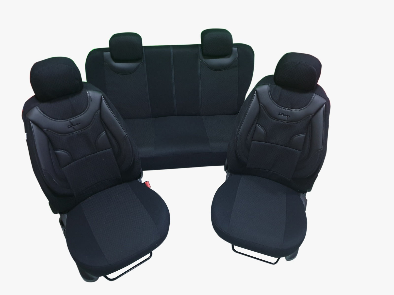 Пълен комплект DESIGN тапицерия/калъфи от еко кожа и текстил / черно с черно / Съвместими с 99% от автомобилите със стандартни седалки. Изработени от качествени устойчиви на износване материали. Запазват оригиналната тапицерия от зацапване и износване. Съвместими със седалки с вградени въздушни възглавници. Закрепя се под седалката с метални ластици и кукички, стои изпънато. Комплектът съдържа калъфи за: Предни седалки Задни седалки Облегалки за глава