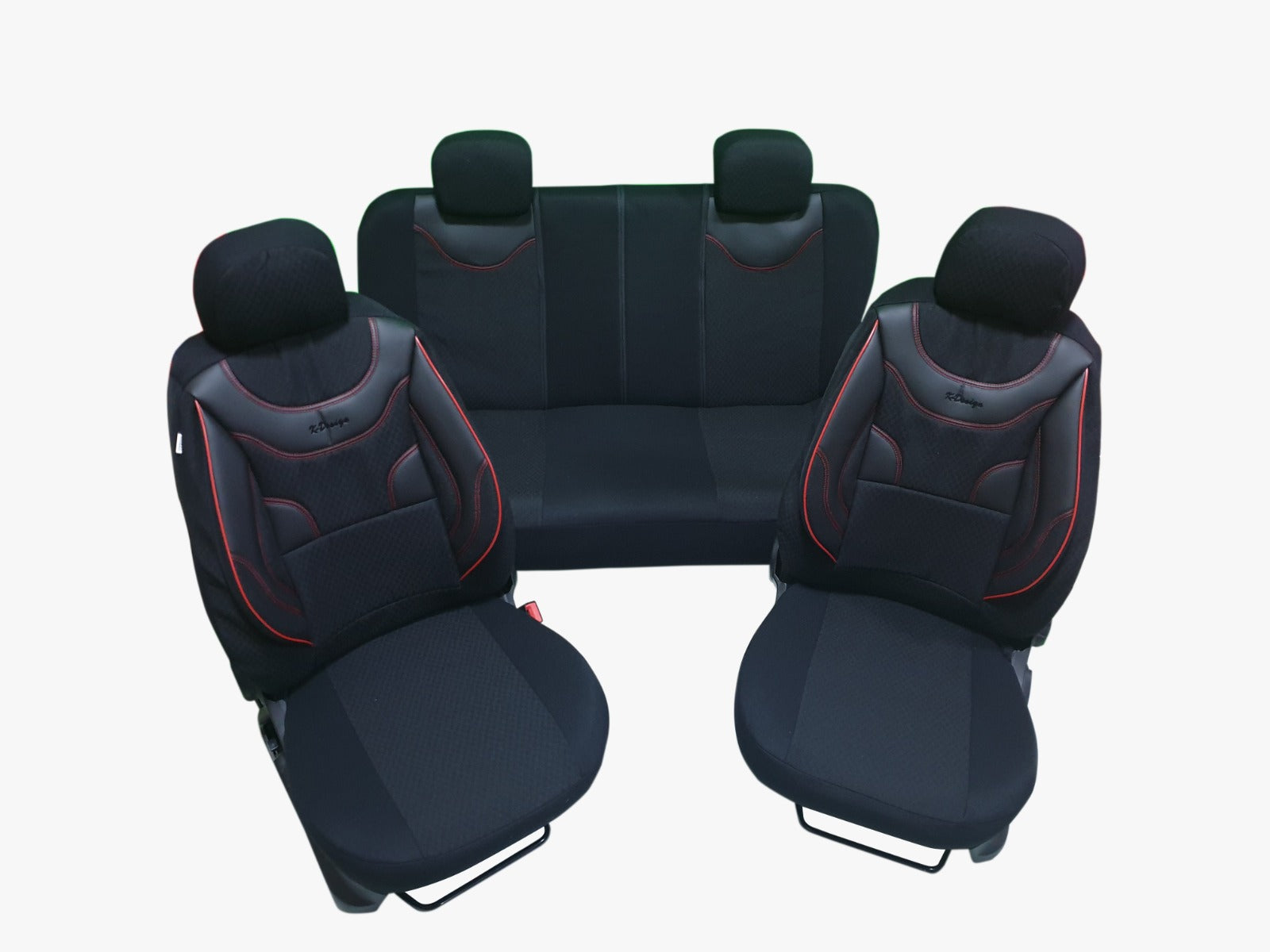 Пълен комплект - DESIGN - тапицерия/калъфи от еко кожа и текстил - / черно - червен кант / - Пълен комплект: Шофьорска седалка, пасажерска седалка и задна седалка. Комплектът включва: 1 x калъф за шофьорската седалка 1 x калъф за пасажерска седалка 1 х калъф за задна седалка 4 x калъфи за облегалки за глава * подходящи за автомобили с ляв и десен волан * Бързо и лесно монтиране - просто поставете върху оригиналните седалки и изпънете (с ластици отдолу, така, че да се изпъват сегнато по седалките) * Подходящи са за автомобили с въздушни възглавници и могат да се ползват с подлакътник. * Лесно почистване - просто забършете. * Ушити от качествен текстил и еко кожа. - Тези калъфи са предназначени да предпазят вашата оригинална тапицерия от замърсяване и износване. - Дори редовно почистване не може да спре ежедневното износване. - Защитете оригиналната тапицерия на автомобила си. За въпроси може да ни потърсите на посочения телефон в работно време.