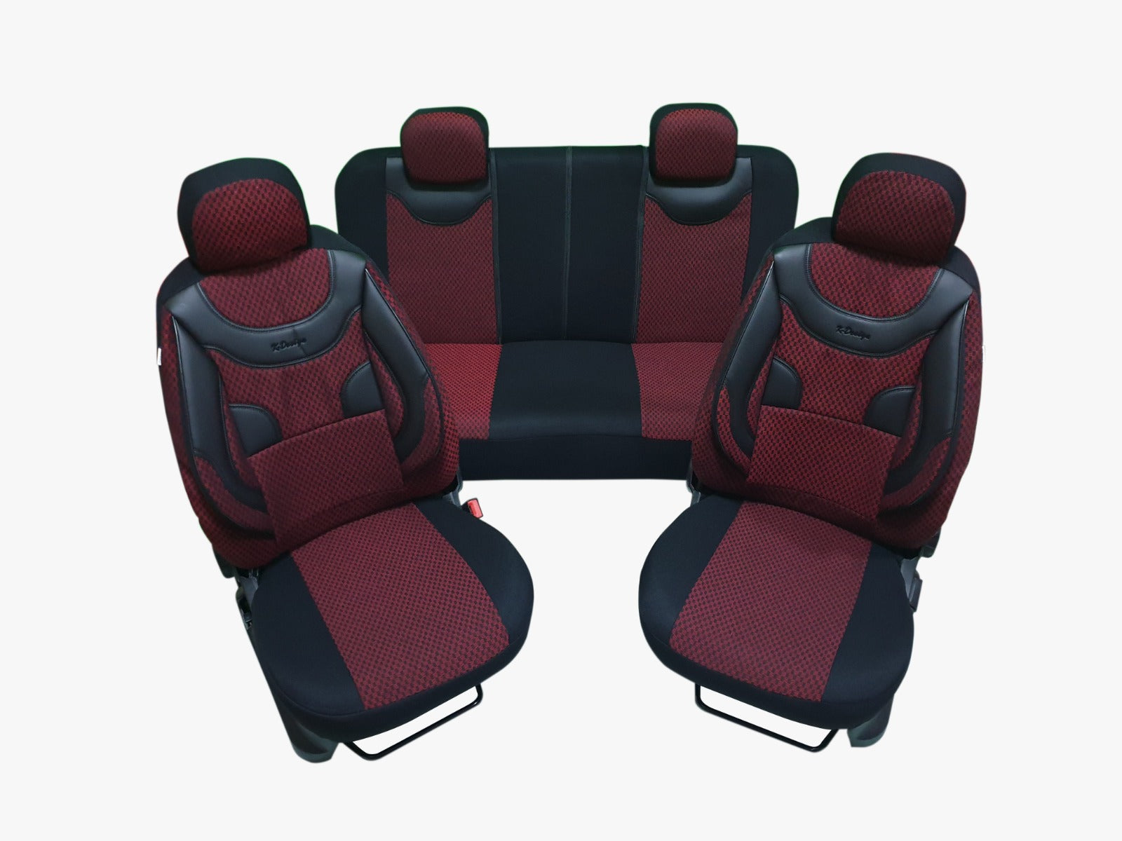 Пълен комплект DESIGN тапицерия/калъфи от еко кожа и текстил / червено с черно / Съвместими с 99% от автомобилите със стандартни седалки. Изработени от качествени устойчиви на износване материали. Запазват оригиналната тапицерия от зацапване и износване. Съвместими със седалки с вградени въздушни възглавници. Закрепя се под седалката с метални ластици и кукички, стои изпънато. Комплектът съдържа калъфи за: Предни седалки Задни седалки Облегалки за глава