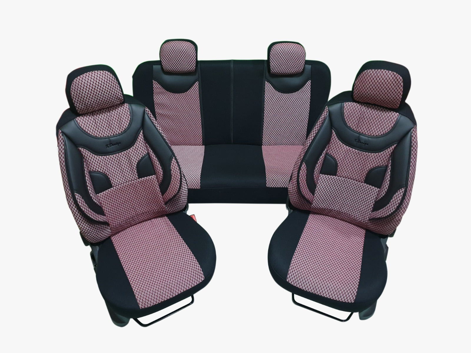 Пълен комплект - DESIGN - тапицерия/калъфи от еко кожа и текстил / розово с черно / Съвместими с 99% от автомобилите със стандартни седалки. Изработени от качествени устойчиви на износване материали. Запазват оригиналната тапицерия от зацапване и износване. Съвместими със седалки с вградени въздушни възглавници. Закрепя се под седалката с метални ластици и кукички, стои изпънато. Комплектът съдържа калъфи за: Предни седалки Задни седалки Облегалки за глава