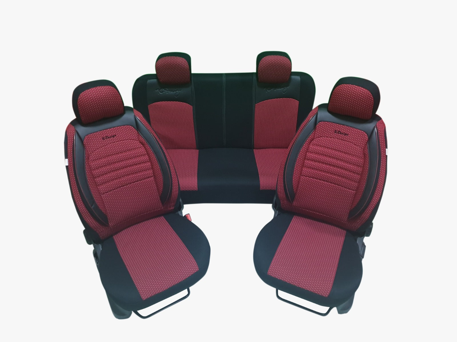 Пълен комплект Червено Черна Тапицерия от Висококачествен Плат И Еко Кожа Луксозна тапицерия Изработени от висококачествен плат и изкусвена кожа , осигуряват удобно чувство за сядане. Ръчно шити. Универсален дизайн, подходящ за всички автомобили. Дизайн, съвместим с airbag - въздушни възглавници. Устойчивост на износване Лесна инсталация. Цялостен дизайн, покрива предната и задната част на седалката. Пакет, включващ: 8 части, предни и задни. Цвят -Бордо